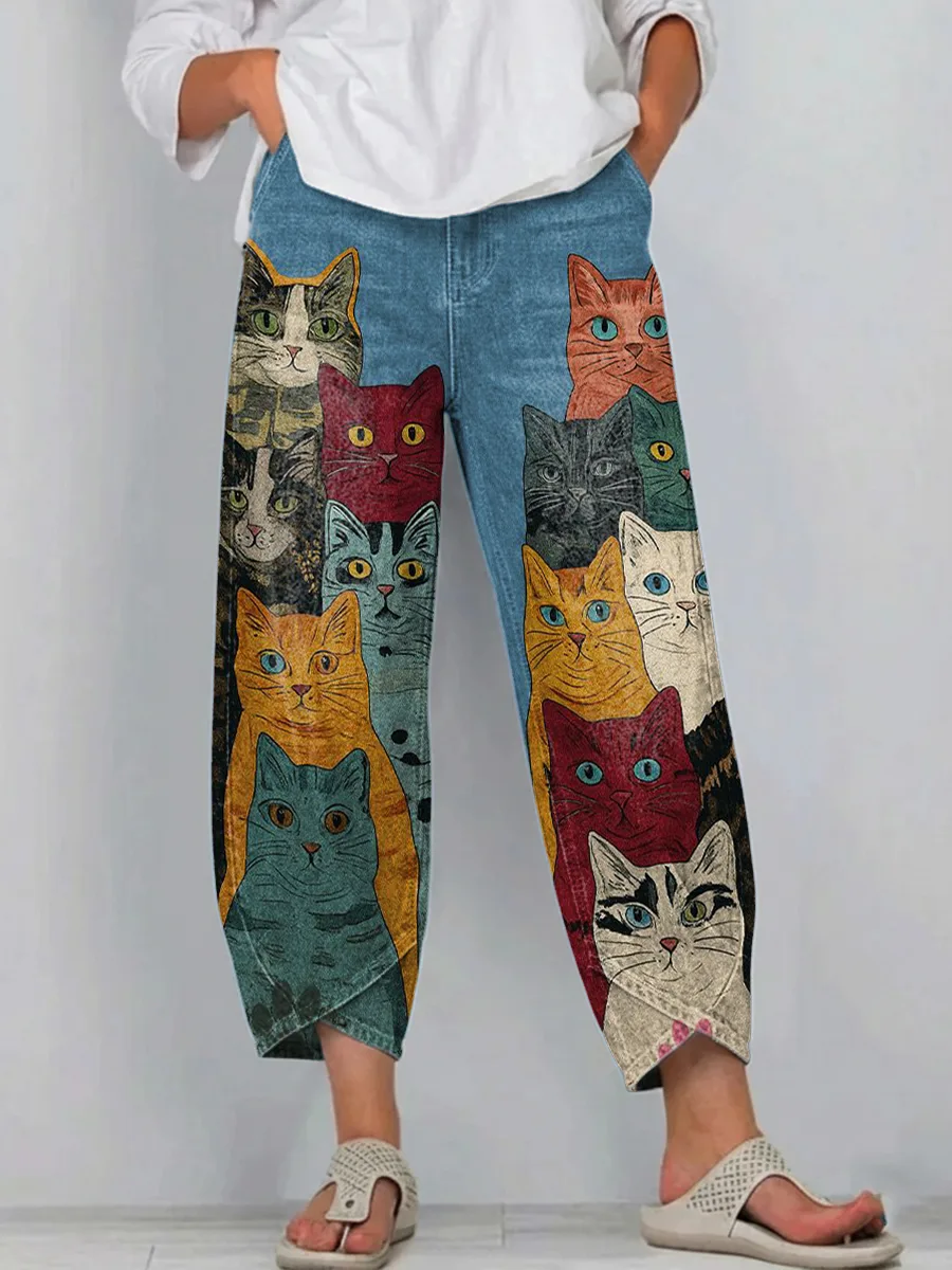 Women's Vintage Funny Cat Art Print Leisure Jeans