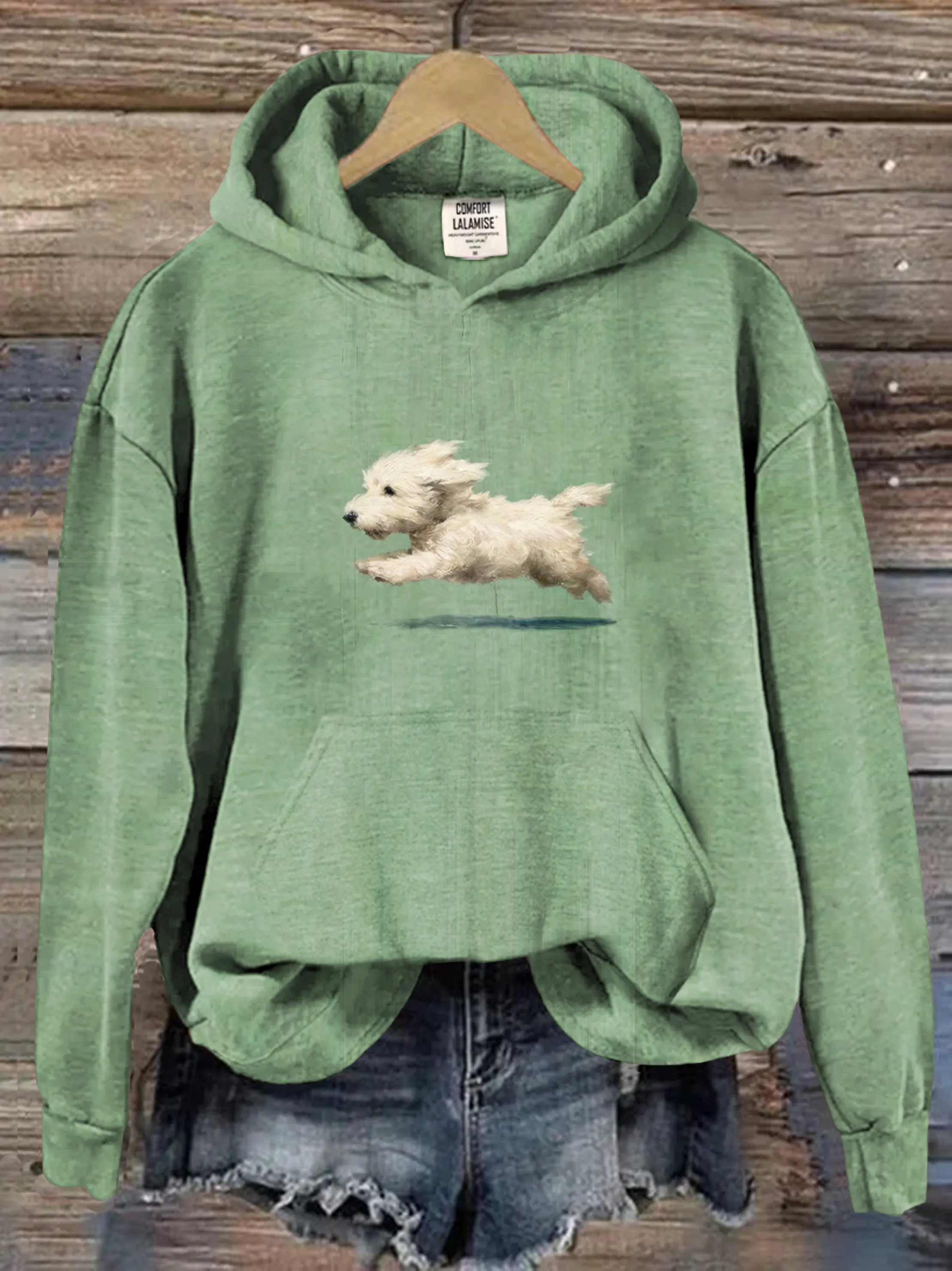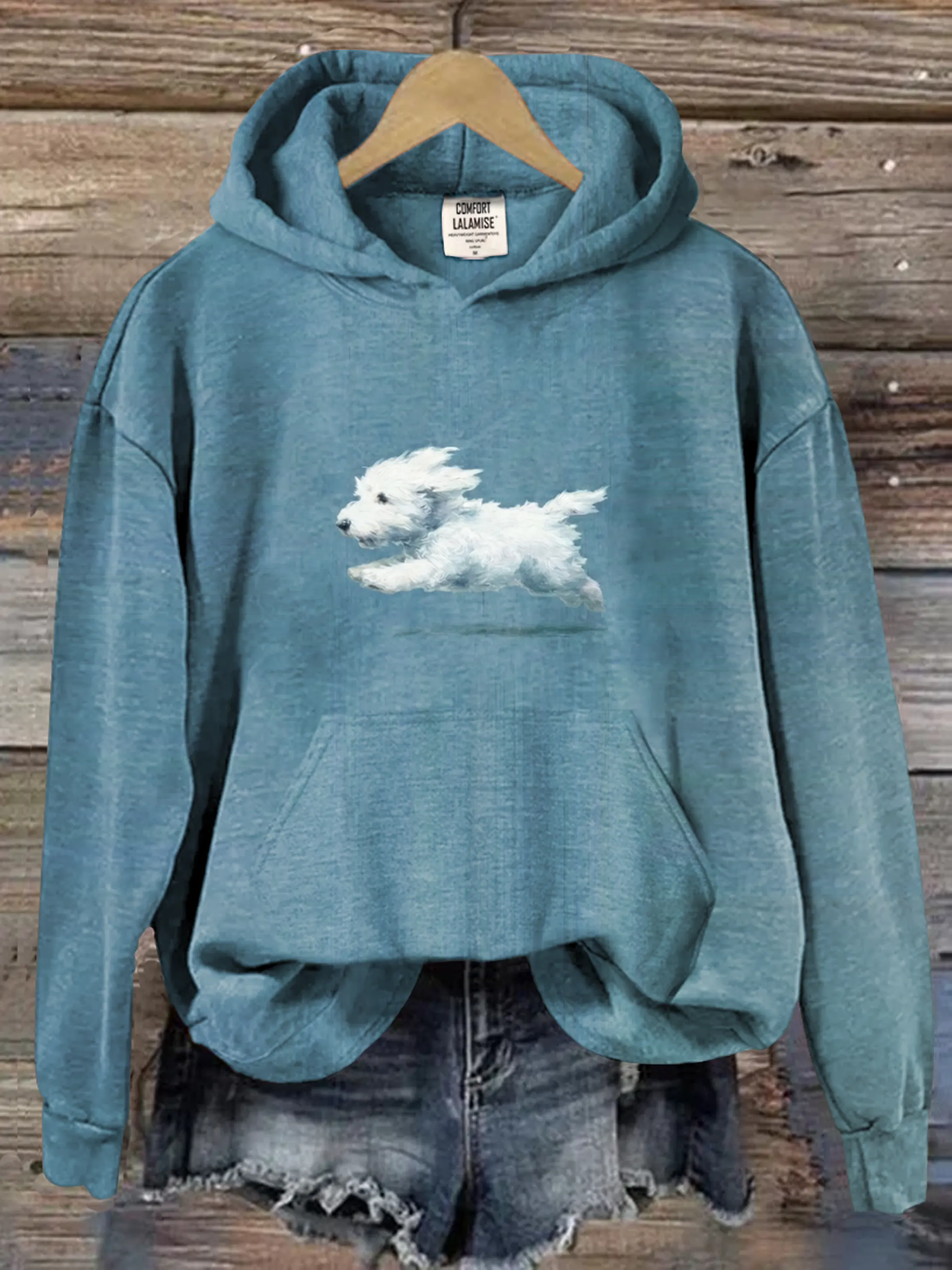 Funny Retro Cute Running White Dog Art Casual Hoodie Sweatshirt