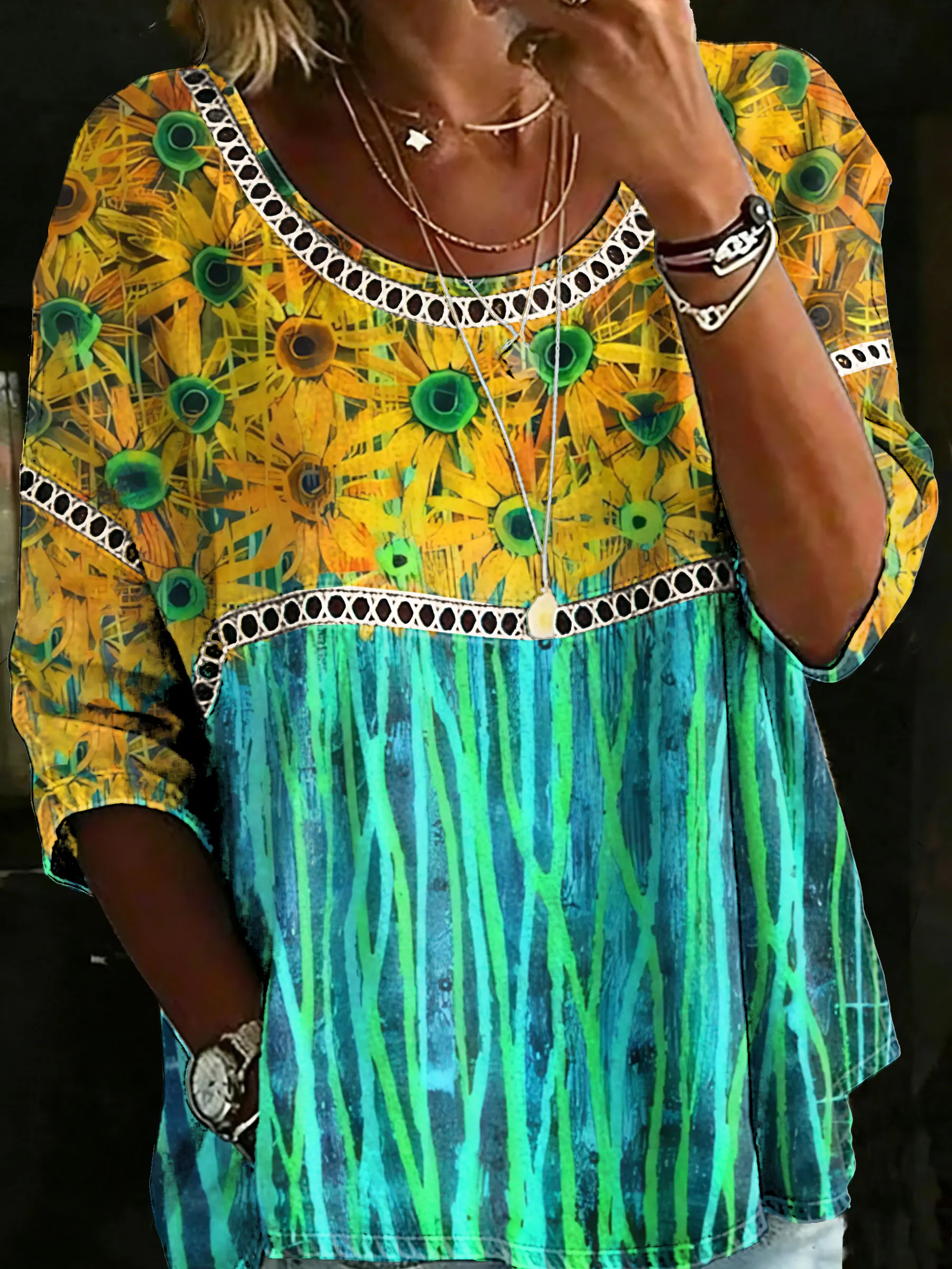 Women's Vintage Concatenate Sunflower Casual Loose Denim Blouse Shirt