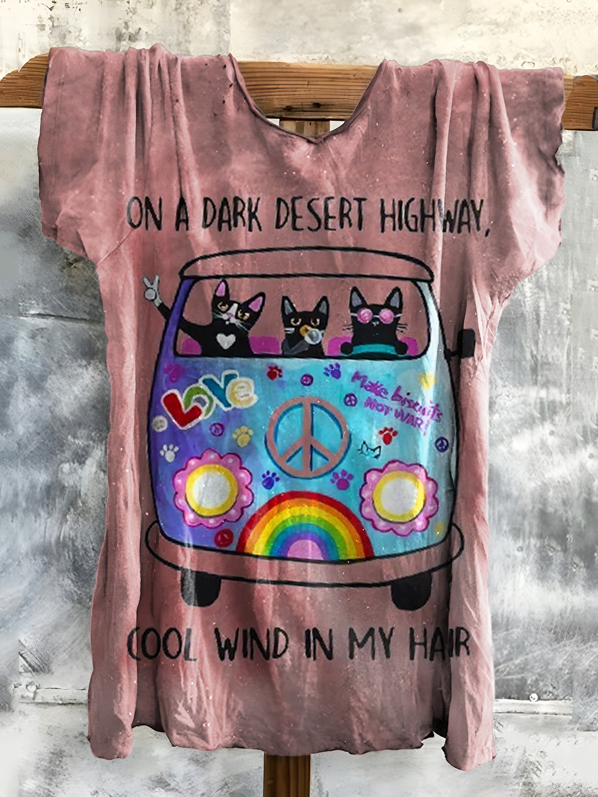 Women's Cats In The Peace Car Hippie Graphic Print Cotton Crew Tee