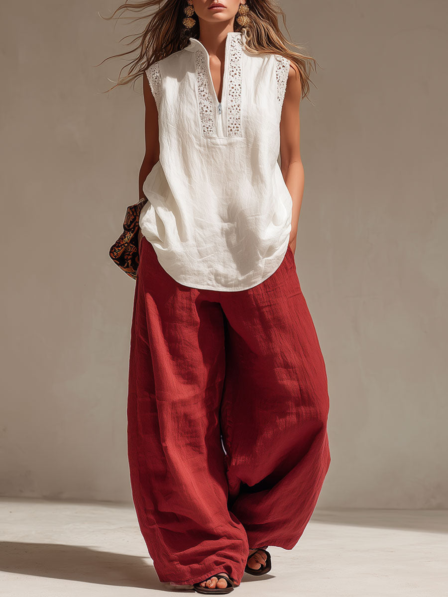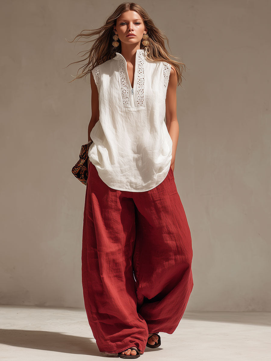 Vacation Retro Lace White Cotton Sleeveless Shirt And Red Pants Set