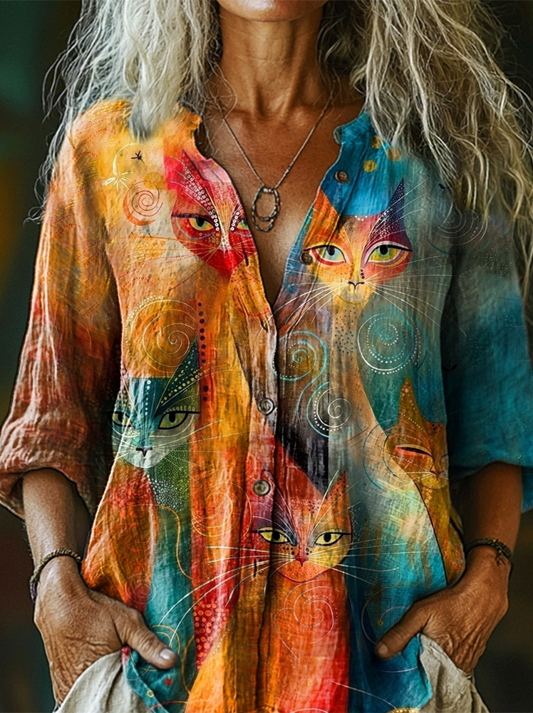 Women's Abstract Cat Art Pattern Print Casual Cotton Linen Shirt
