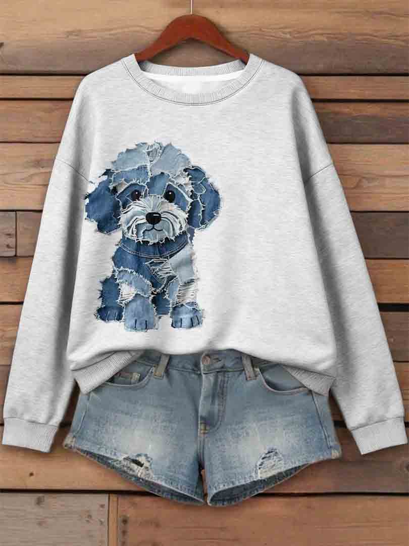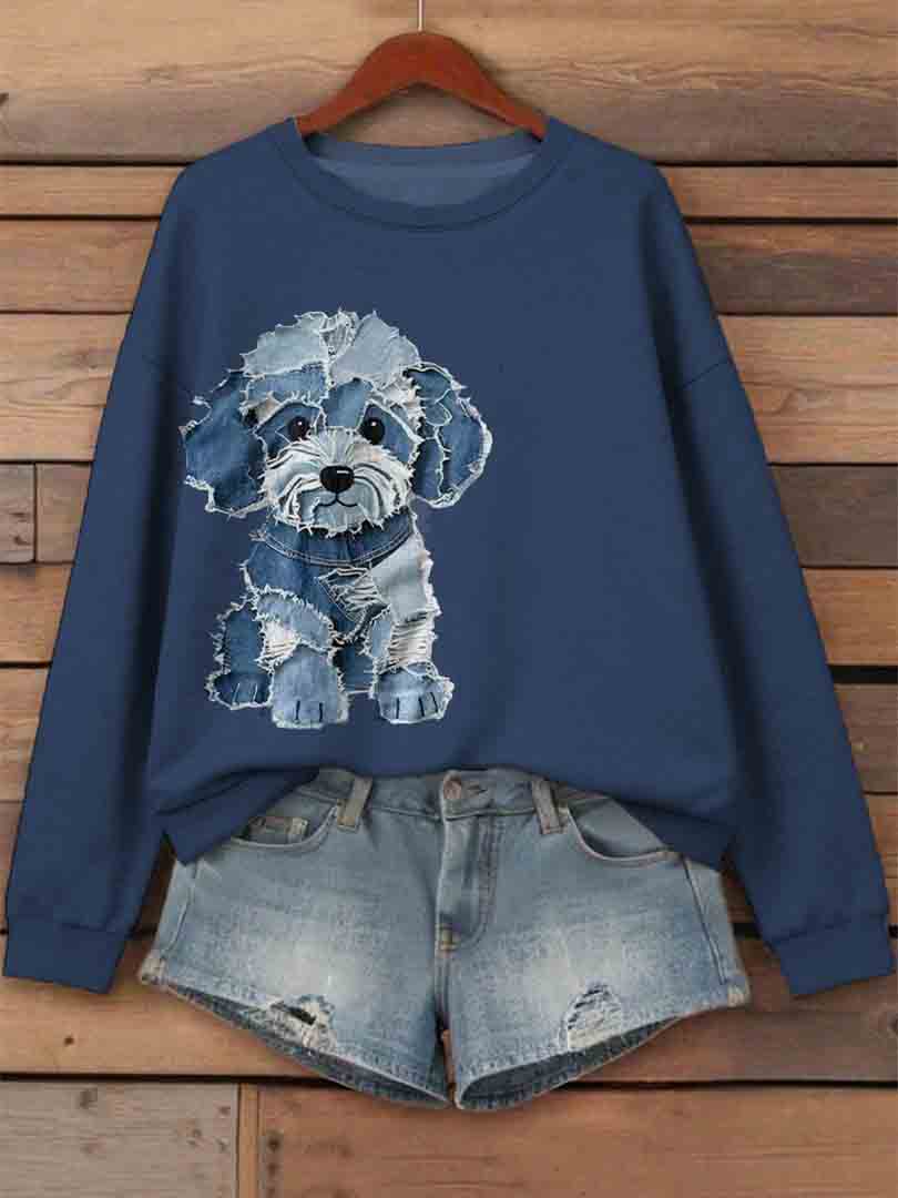 AVA – Women’s Sweatshirt with Patchwork Design and Denim Print of a Fluffy Dog