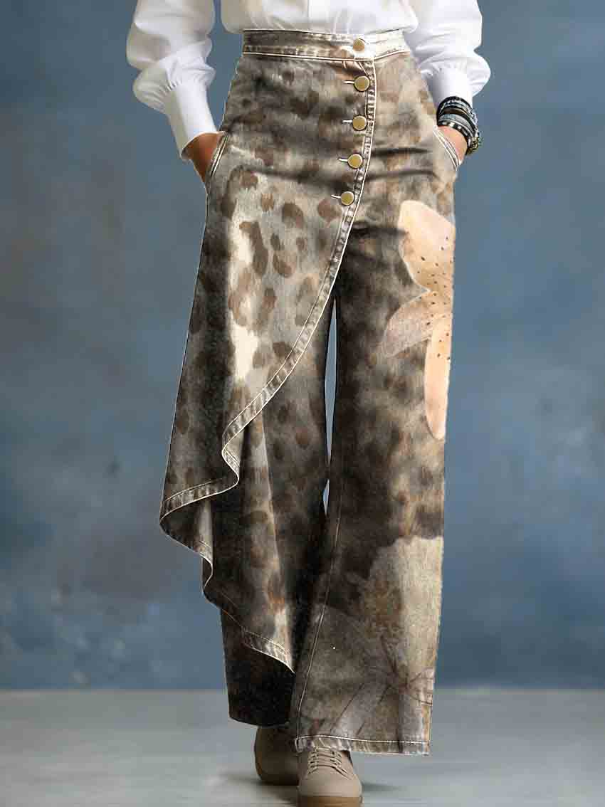 Women's Vintage Leopard Print Lily Art Stylish Design High-waisted Relaxed Fit Wide-leg Jeans