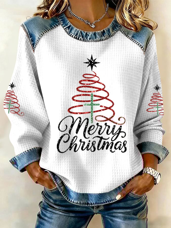 Christmas Tree Snowflake Art Denim Patchwork Print Casual Long Sleeved Sweatshirt$36.99 USD -