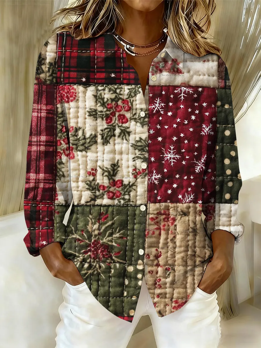 Women's Christmas Contrast Patchwork Print Casual Lapel Shirt$29.99 USD -