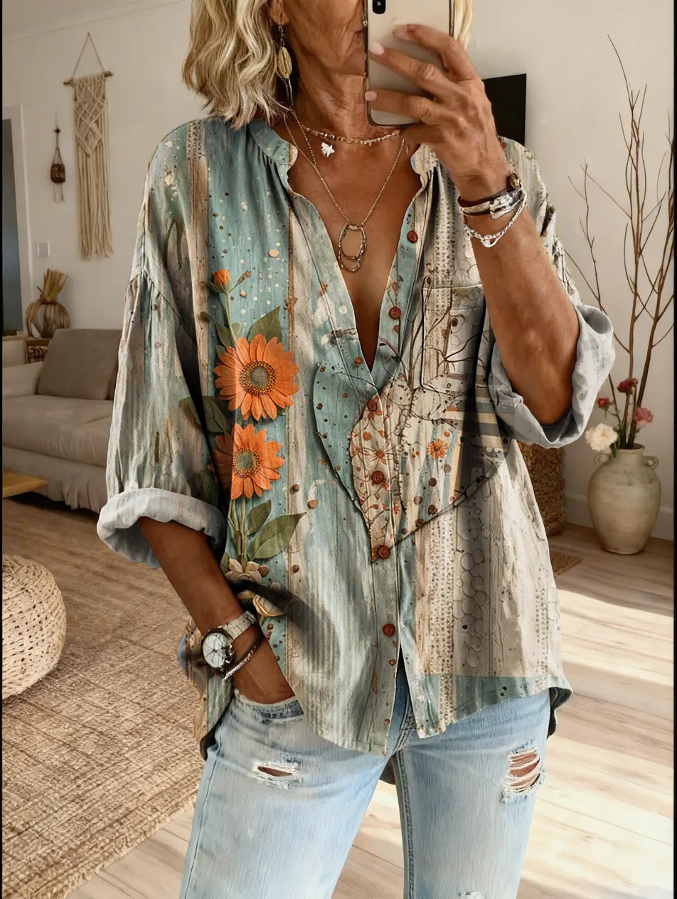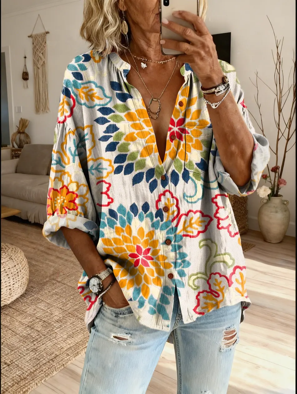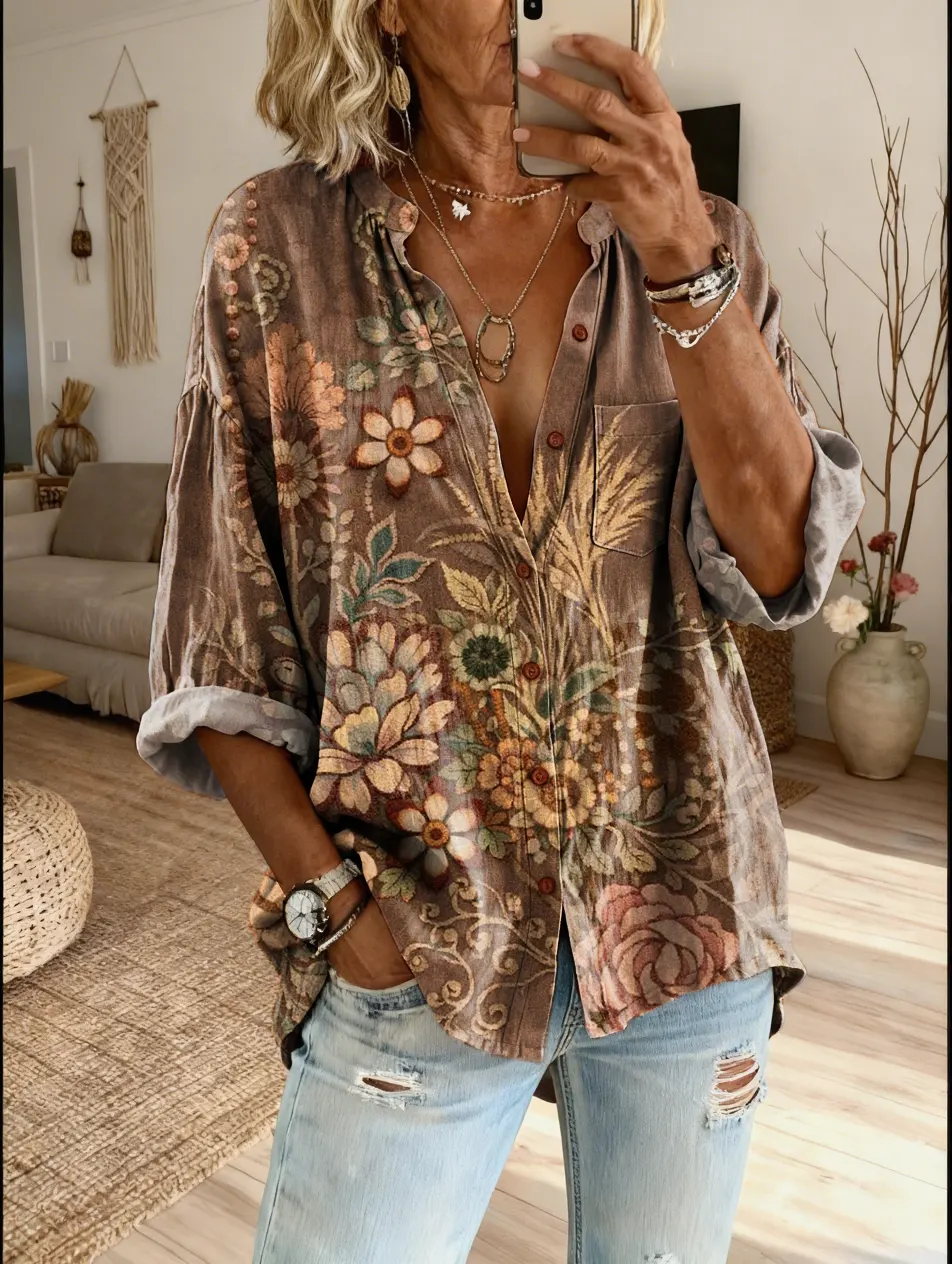 Women's Bohemian Retro Petal Art Print Casual Cotton-Linen Shirt$39.99 USD -