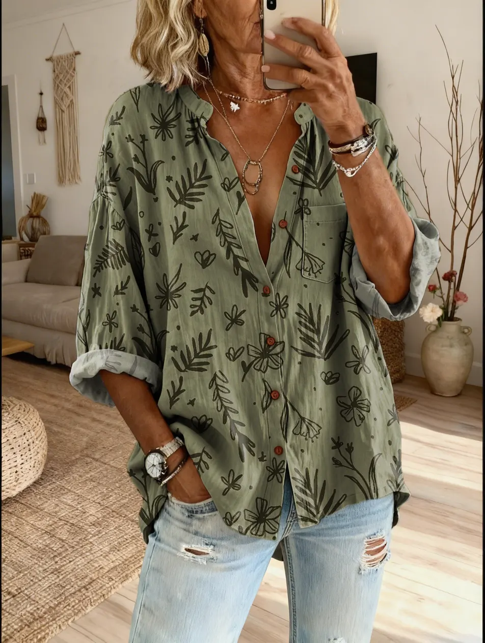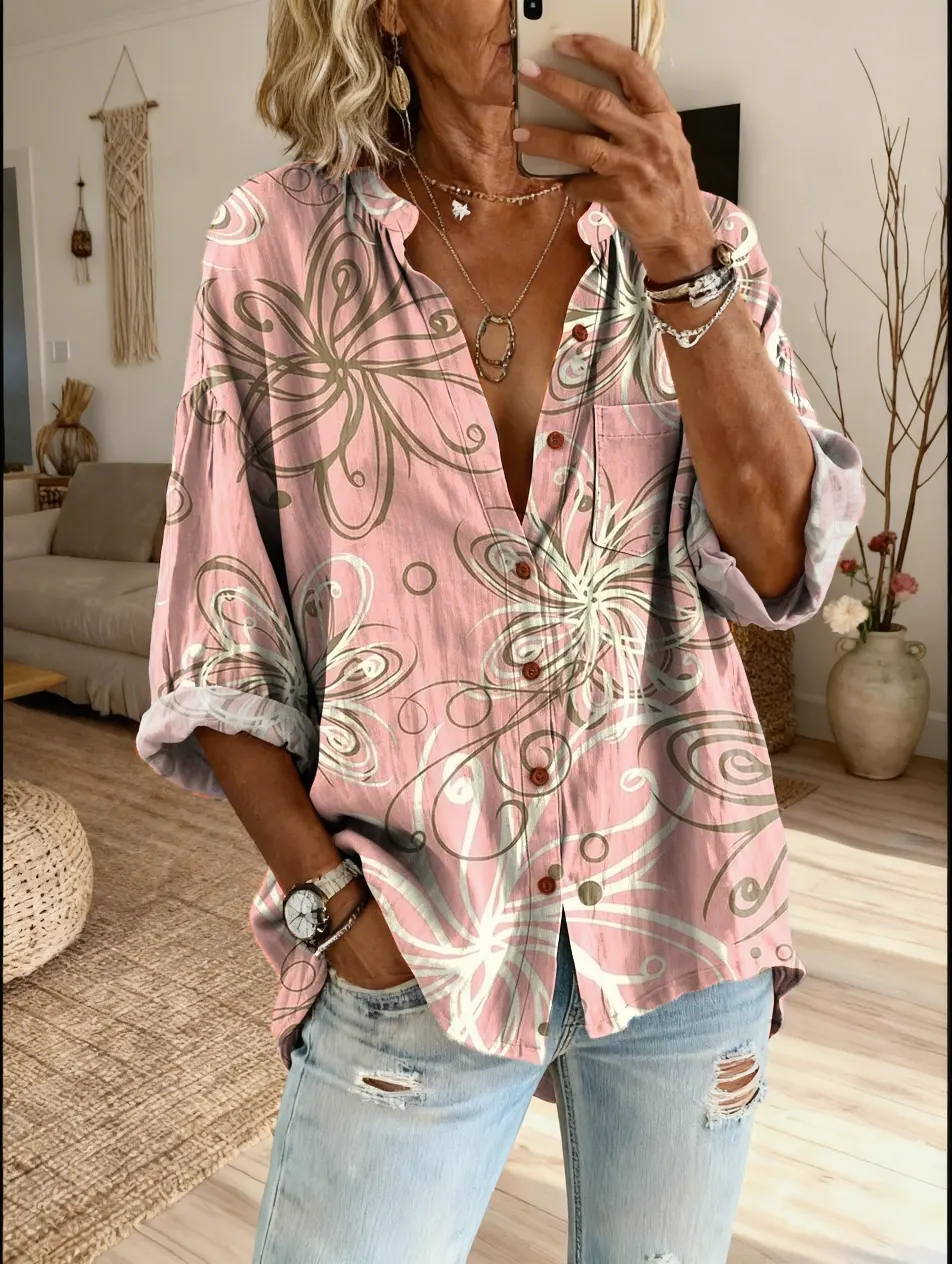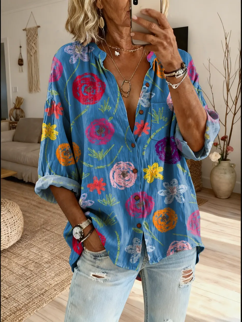 Women's Bohemian Retro Petal Art Print Casual Cotton-Linen Shirt$39.99 USD -