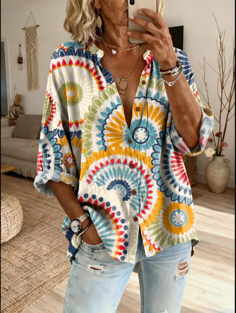 Ethnicity Bohemia Kaleidoscope Women's Vintage Art Print Casual Cotton And Linen Shirt$39.99 USD -