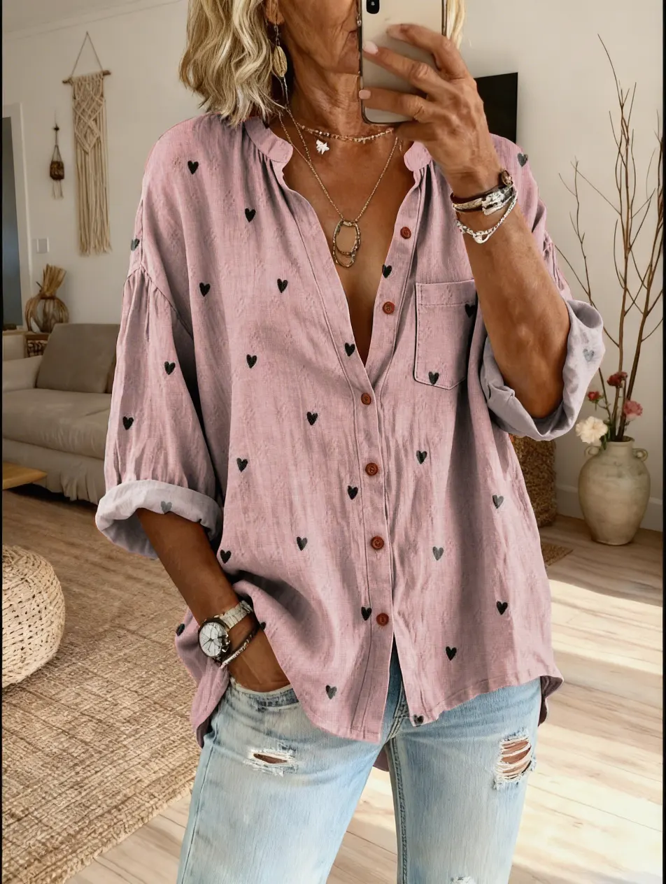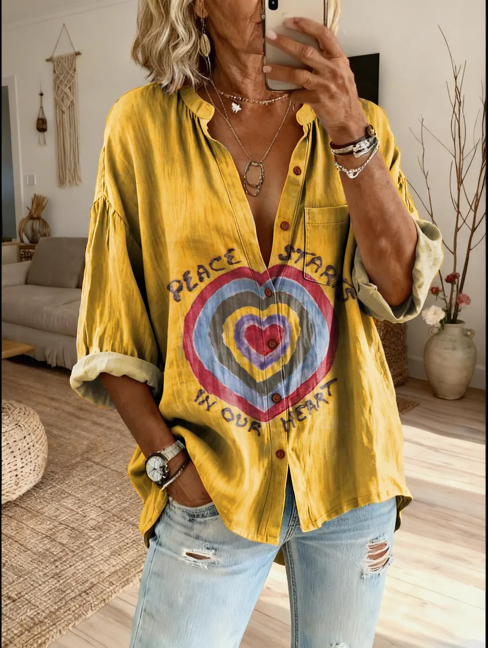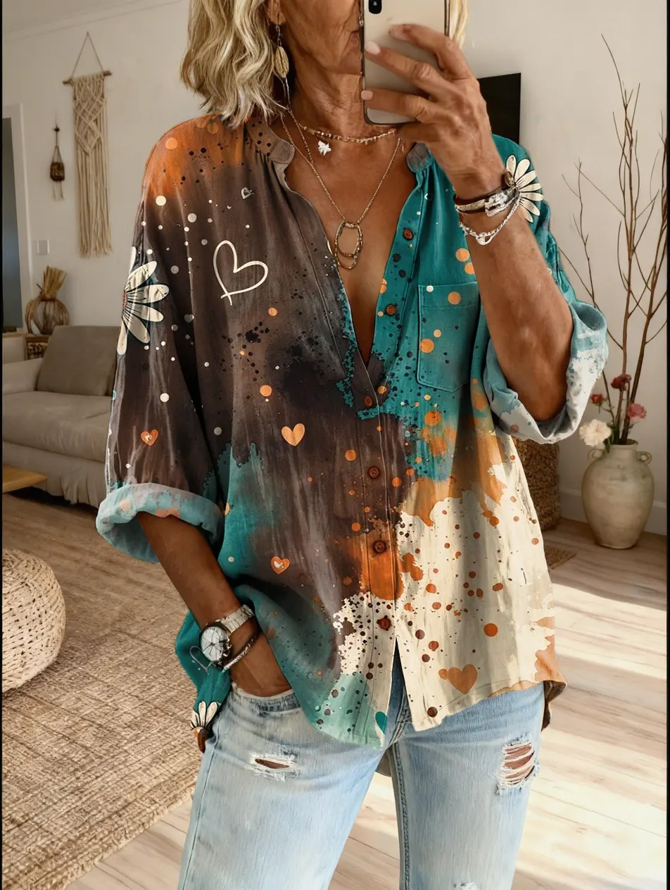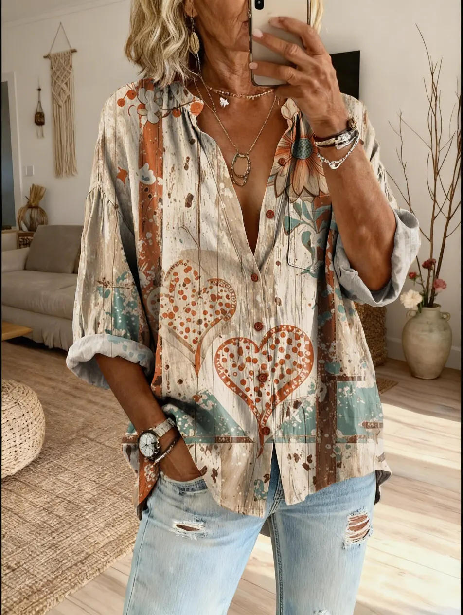 Women's Artistic Heart-pattern Printed Casual Cotton-linen Blend Shirt$39.99 USD -