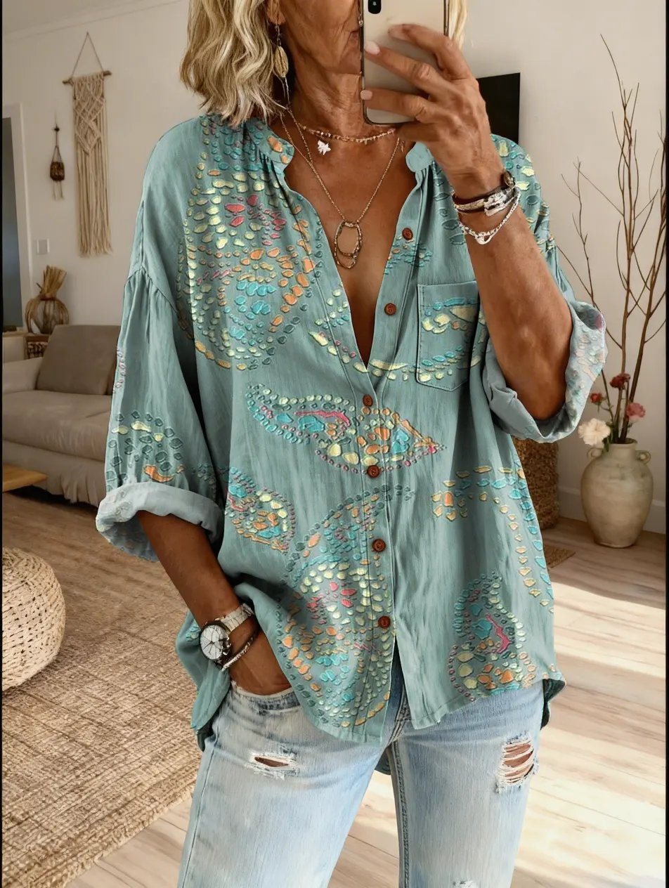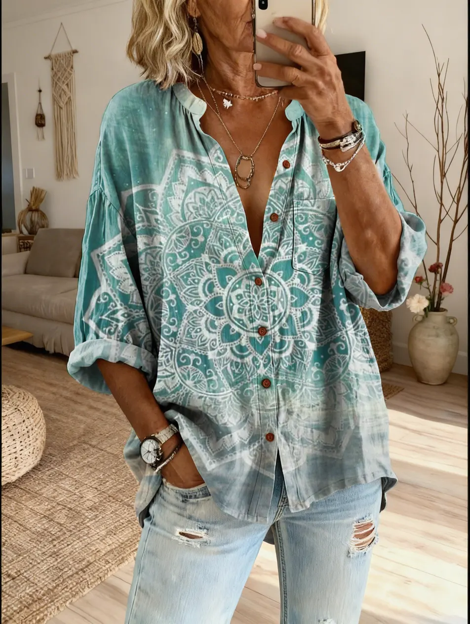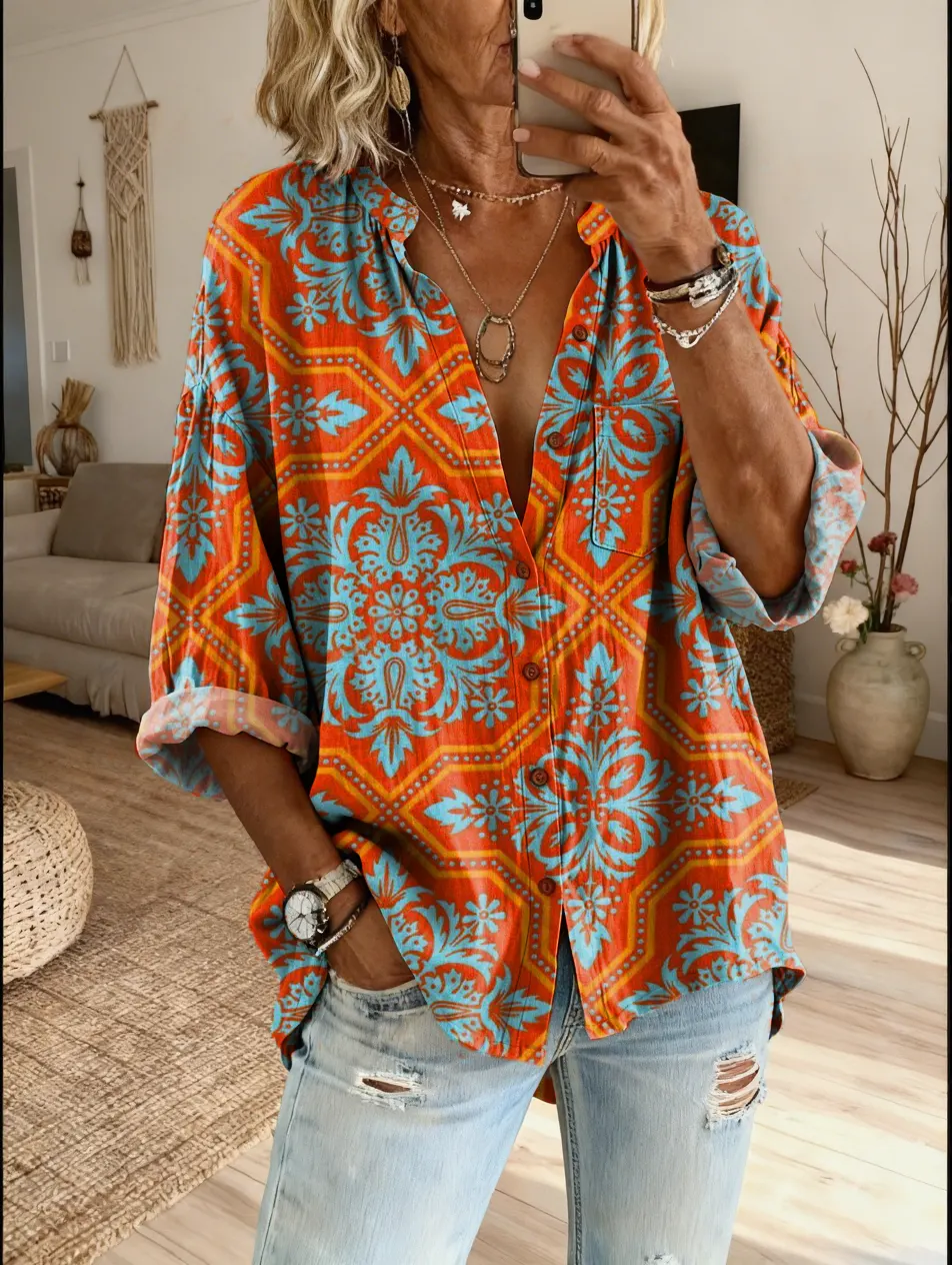 Women's Bohemian Vintage-Patterned Artistic Print Casual Cotton-Linen Shirt$39.99 USD -