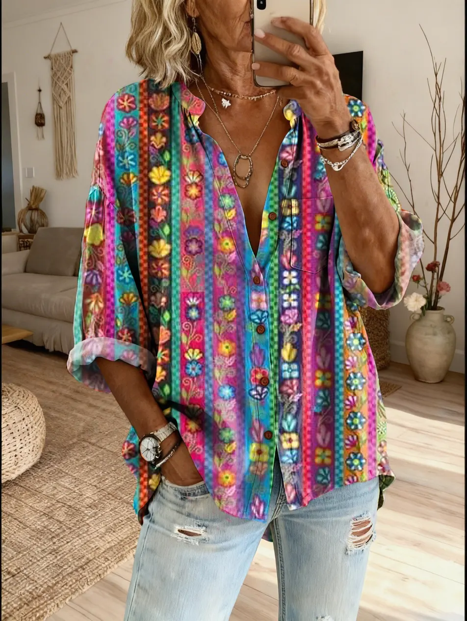 Ethnicity Texture Flowers Bohemia Women's Vintage Art Print Casual Cotton And Linen Shirt$39.99 USD -