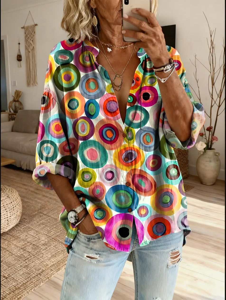 Women's Geometric Art Print Casual Cotton-Linen Blend Shirt$39.99 USD -