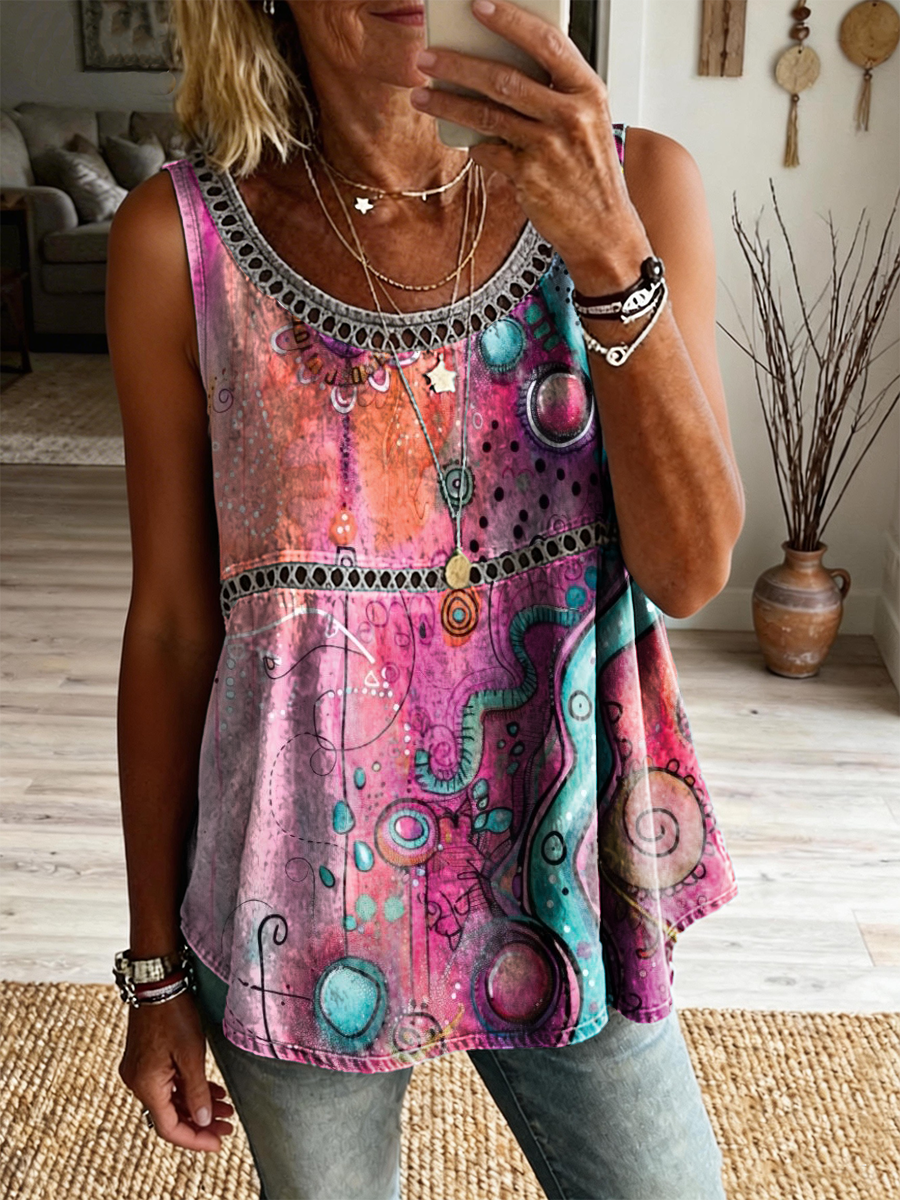 Women's Retro Colorful Art Print Casual Sleeveless Hollow-out Cotton Linen Vest$30.99 USD -