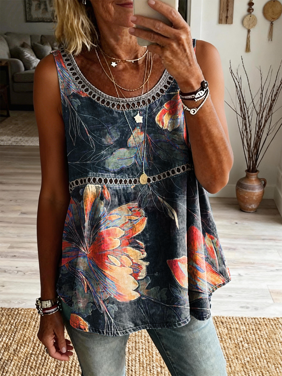 Women's Retro Floral Art Print Casual Sleeveless Hollow-out Cotton Linen Vest$30.99 USD -