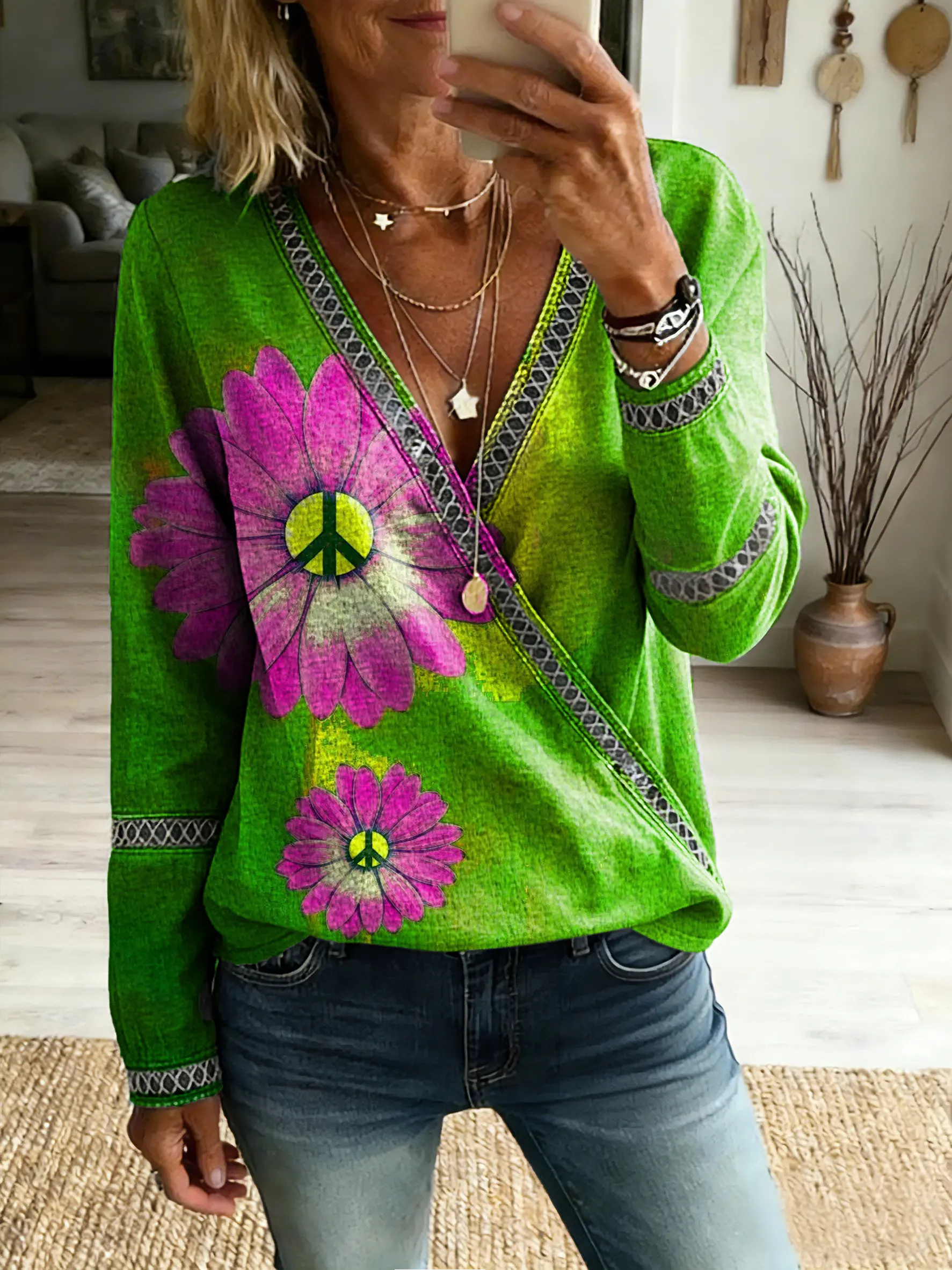 Women's Retro Hippie Floral Art Print Casual V-Neck Cutout Top$35.99 USD -