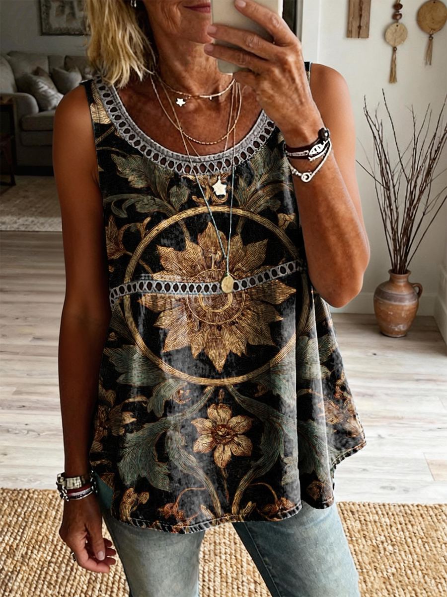 Women's Retro Bohemian Floral Art Print Casual Sleeveless Hollow-out Cotton Linen Vest$30.99 USD