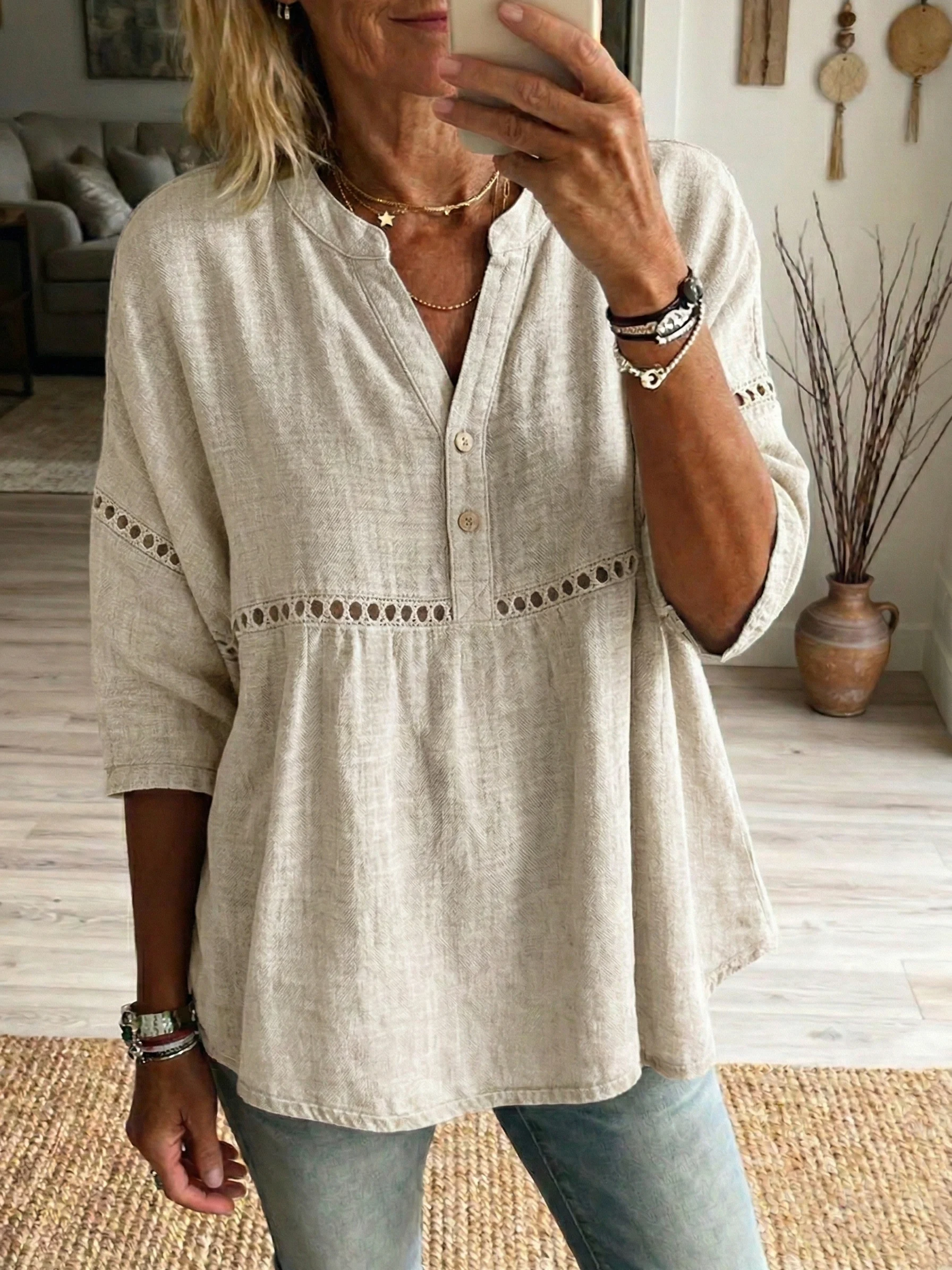 Women's Comfortable Casual Patchwork Lace Henley-neck Short-sleeved Top$33.99 USD -