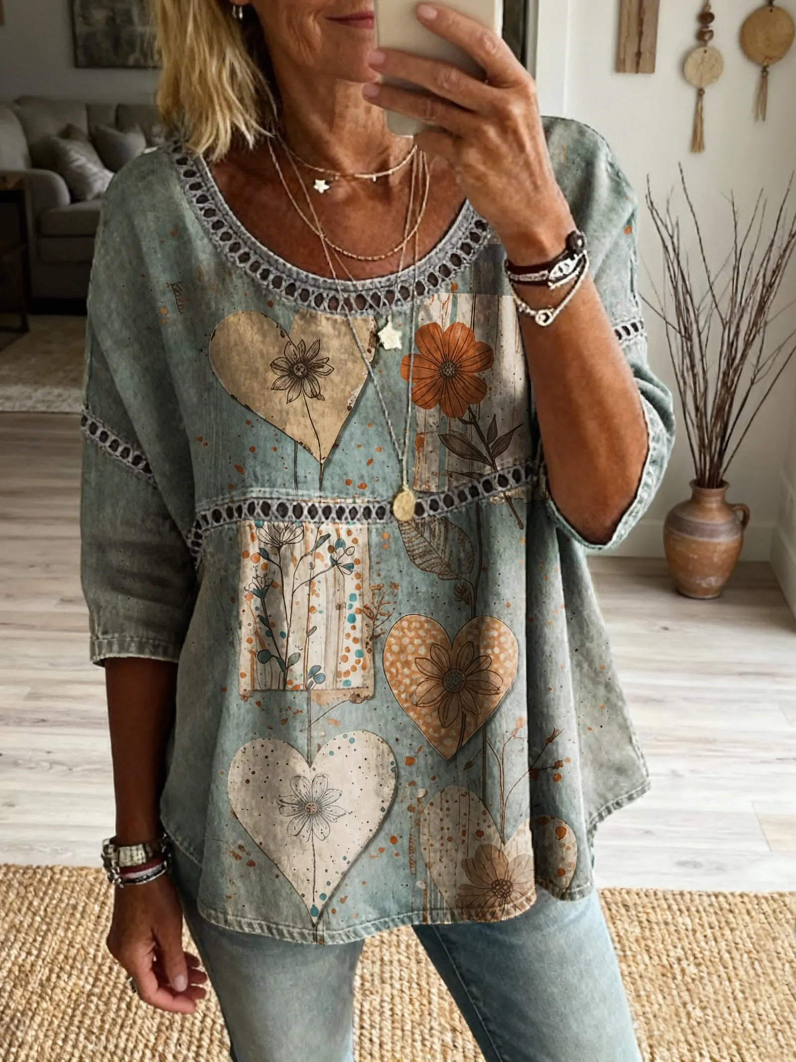 Women's Bohemian Floral Heart Art Print Casual Cutout Top$39.99 USD -