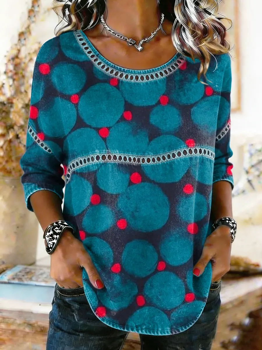 Women's Patchwork Floral Art Print Casual Round Neck Hollowed-out Top$33.99 USD -