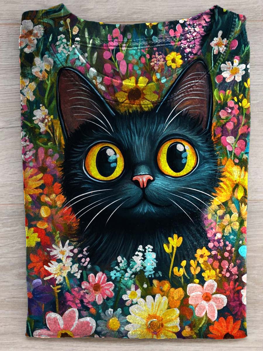A Black Cat Among Sunflowers Cute Cat Art Print T-shirt$24.99 USD -
