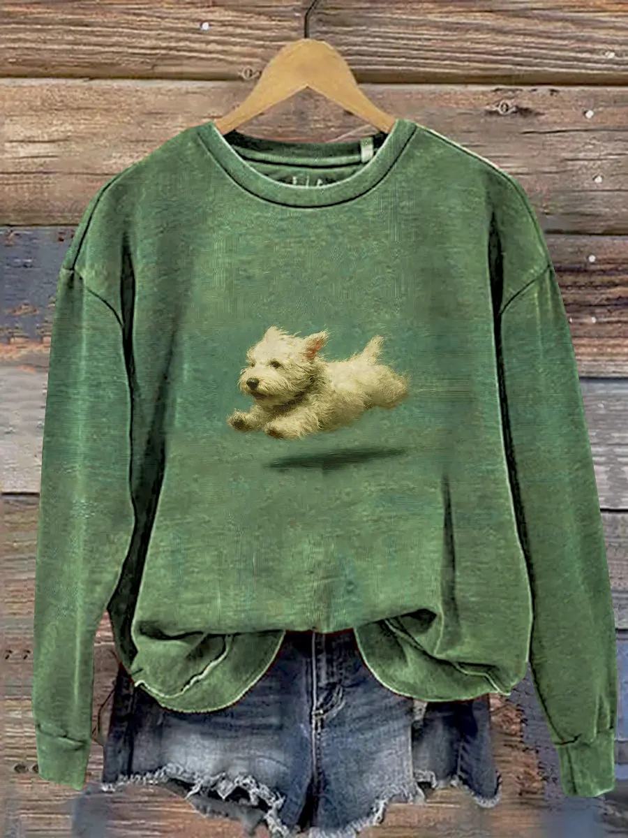Funny Retro Cute Running White Dog Art Print Casual Sweatshirt$29.99 USD -