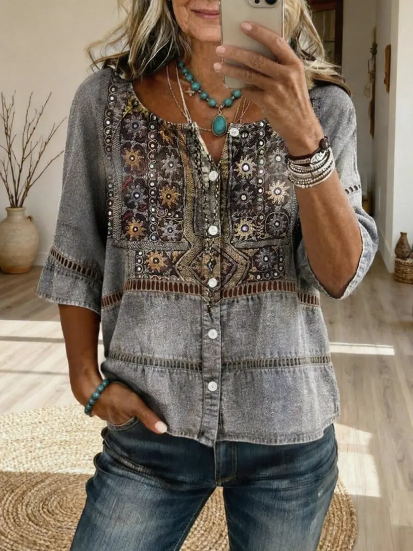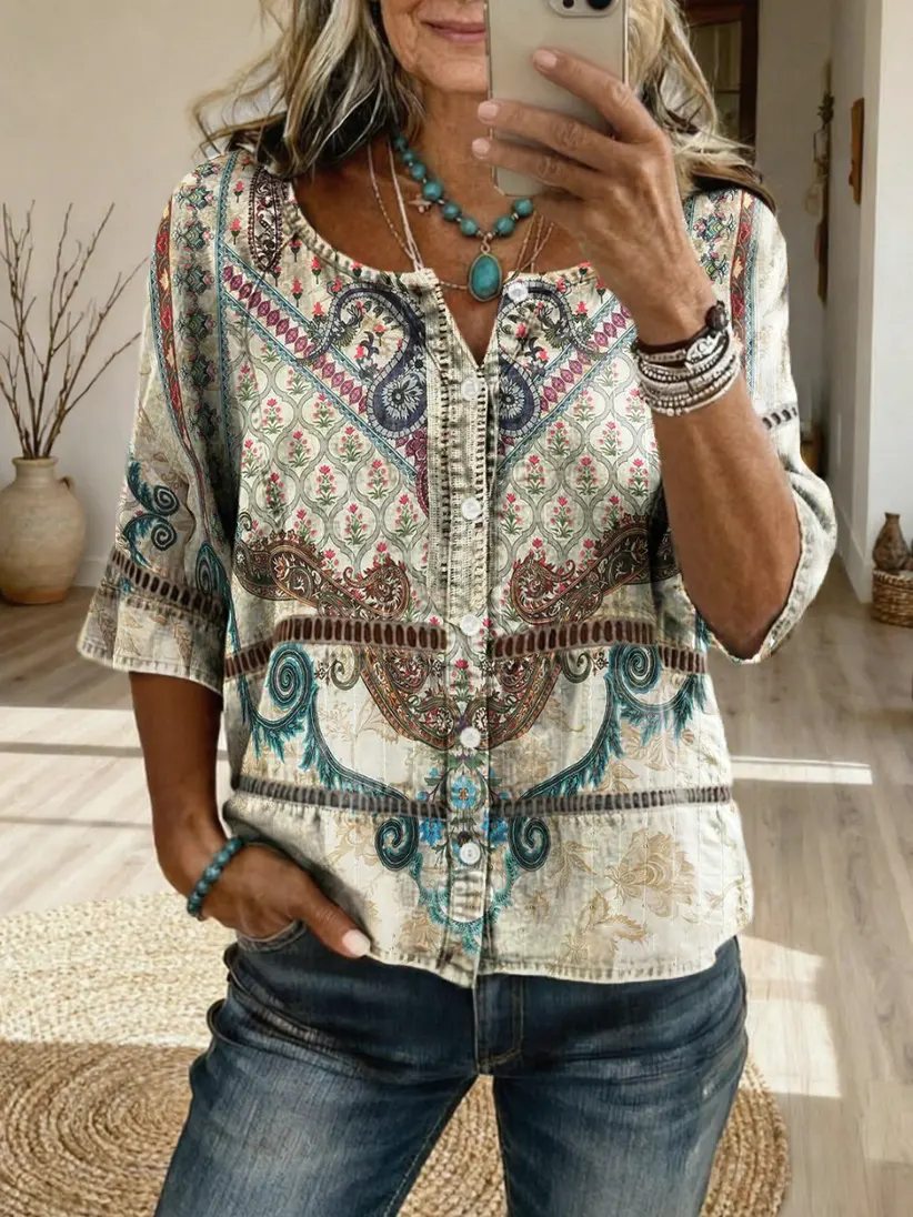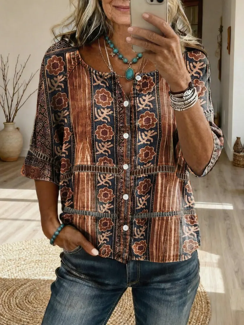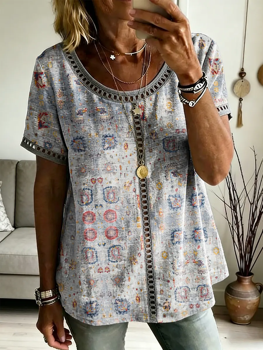 Women's Bohemian-Patterned Artistic Print Casual Cutout Top$39.99 USD -