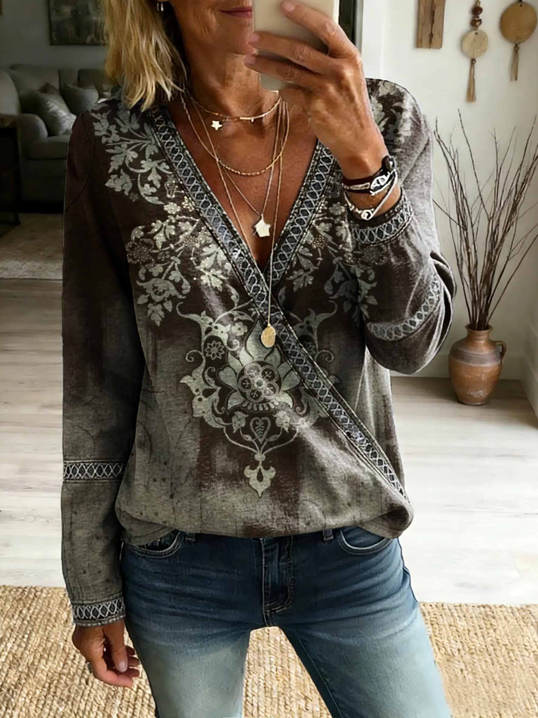 Ethnicity Texture Bird Flowers Women's Vintage Art Print Casual V Neck Cutout Top$34.99 USD -