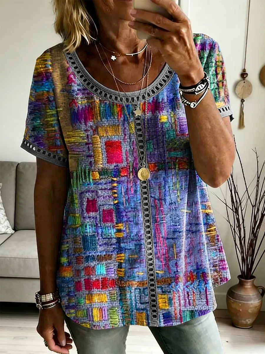 Ethnicity Geometry Texture Women's Art Print Casual Round Neck Short-sleeved Cutout Top$35.99 USD -