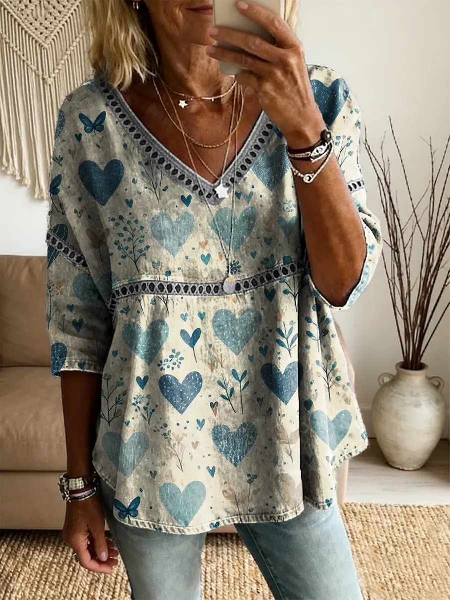Ethnicity Bohemia Love Women's Vintage Art Print Casual V Neck Cutout Top$34.99 USD -