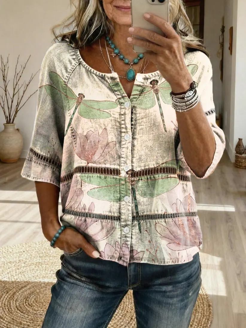Women's Vintage Dragonfly Floral Art Print Casual V-Neck Cutout Top$35.99 USD -
