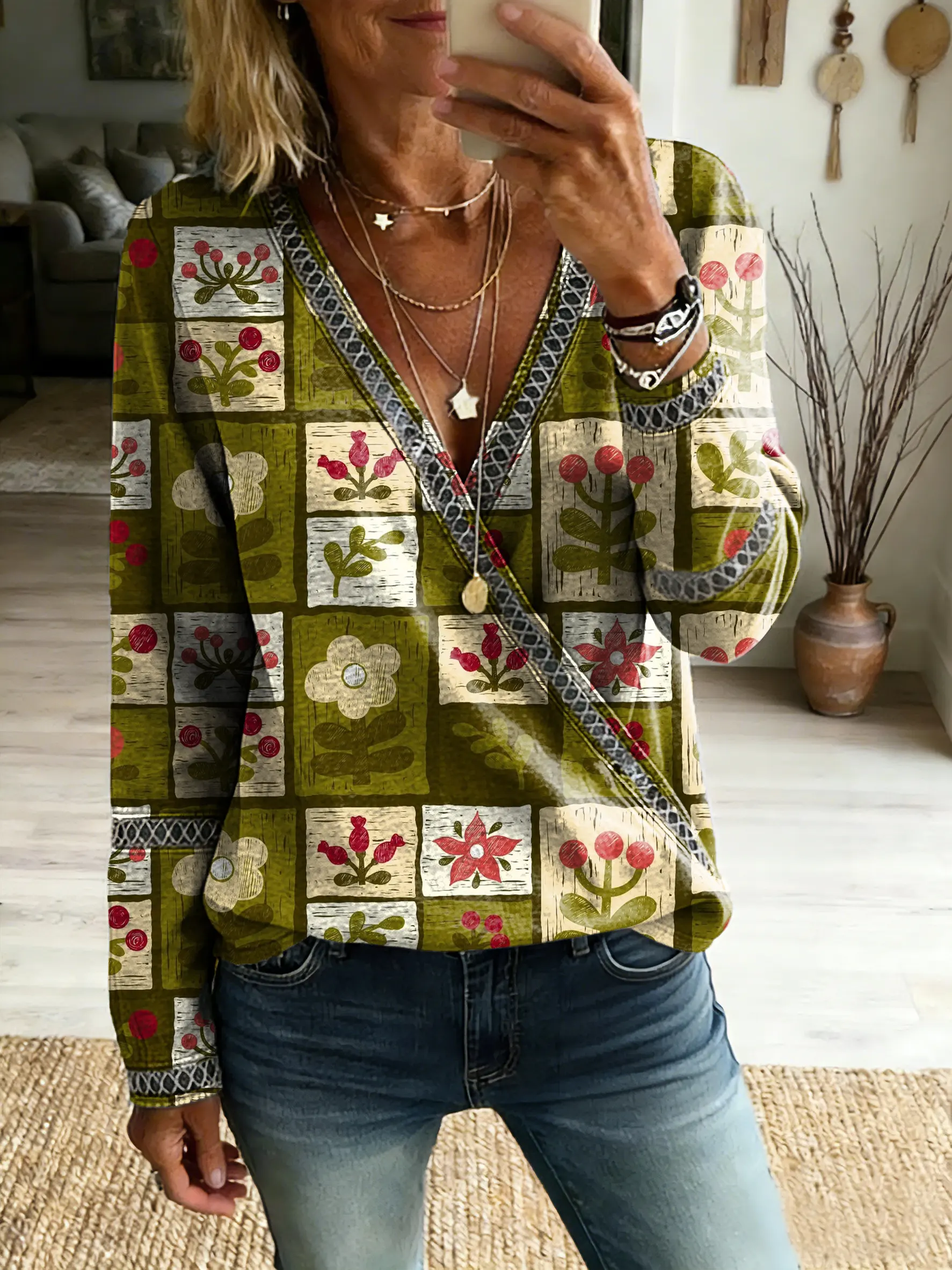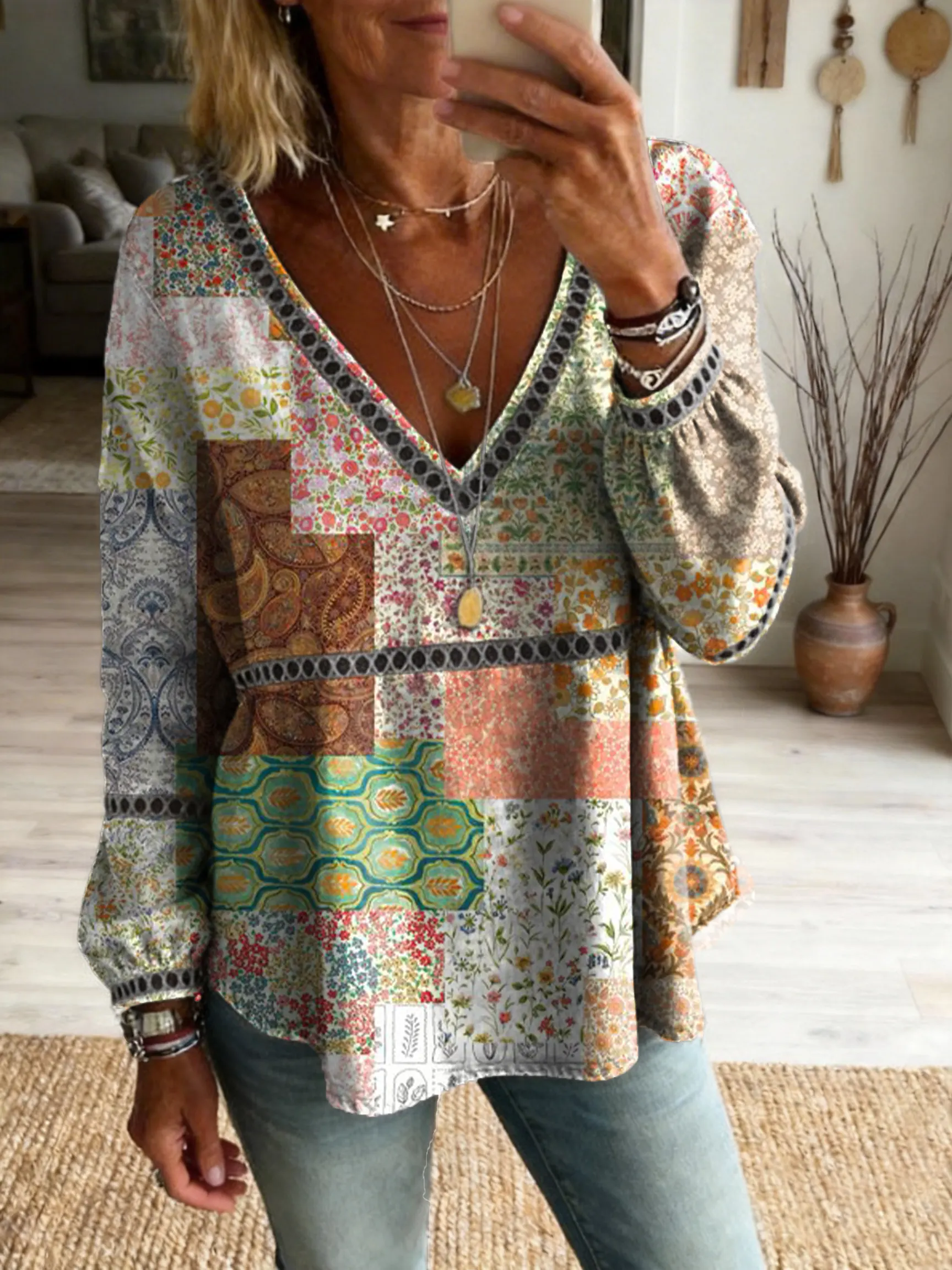 Ethnicity Patchwork Texture Flowers Women's Vintage Art Print Casual V Neck Cutout Top$34.99 USD -