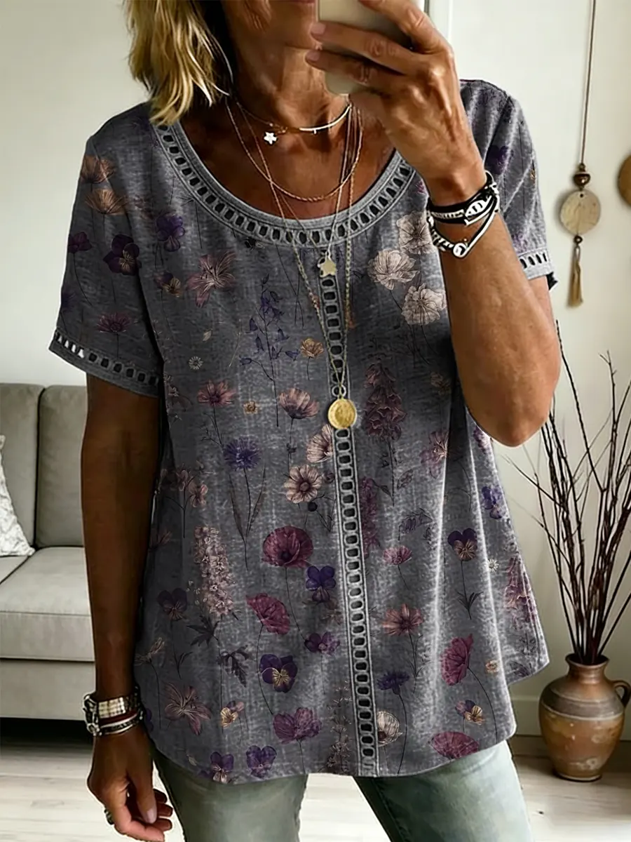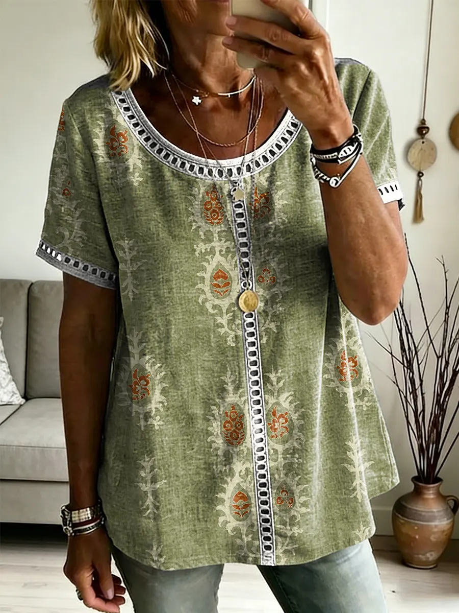 Ethnicity Bohemian Style Flowers Women's Art Print Casual Round Neck Short-sleeved Cutout Top$35.99 USD -
