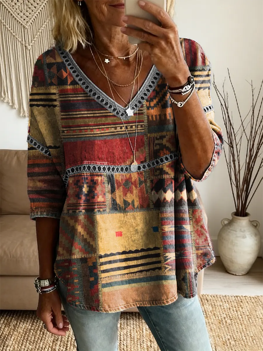 Ethnicity Retro Patchwork Women's Vintage Art Print Casual V Neck Cutout Top$34.99 USD -