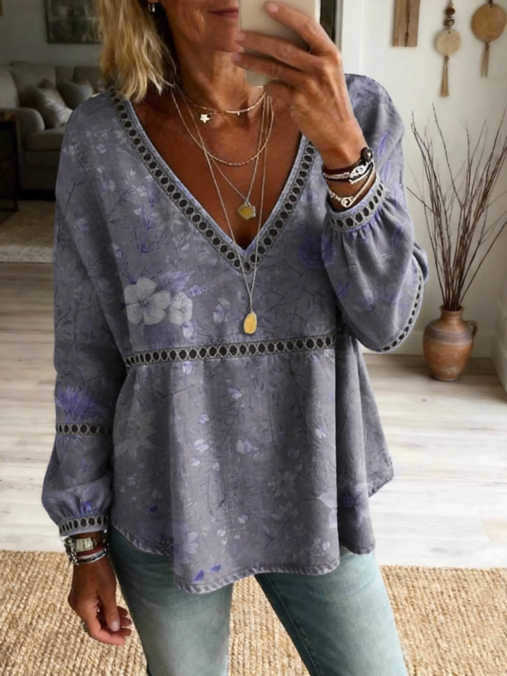 Women's Bohemian-Style Ethnic Floral Art Print Casual Cutout Top$39.99 USD -