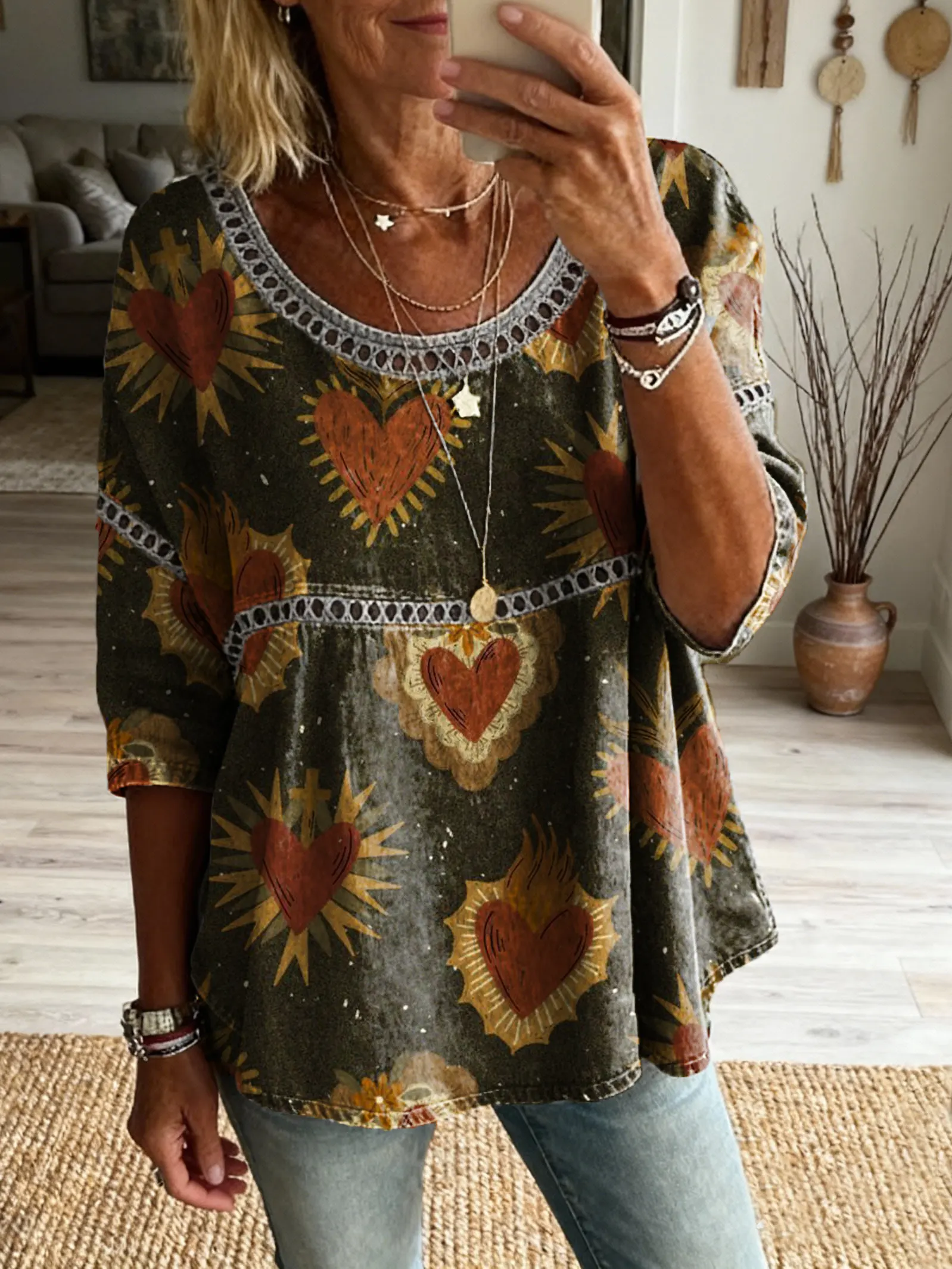 Ethnicity Bohemia Love Women's Vintage Art Print Casual Round Neck Cutout Top$33.99 USD -