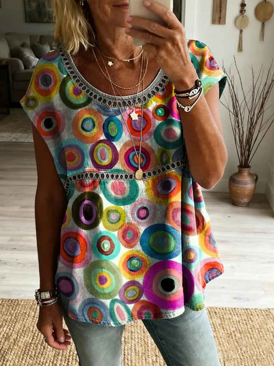Ethnicity Colorful Geometry Women's Vintage Art Print Casual Round Neck Short-sleeved Cutout Top$33.99 USD -