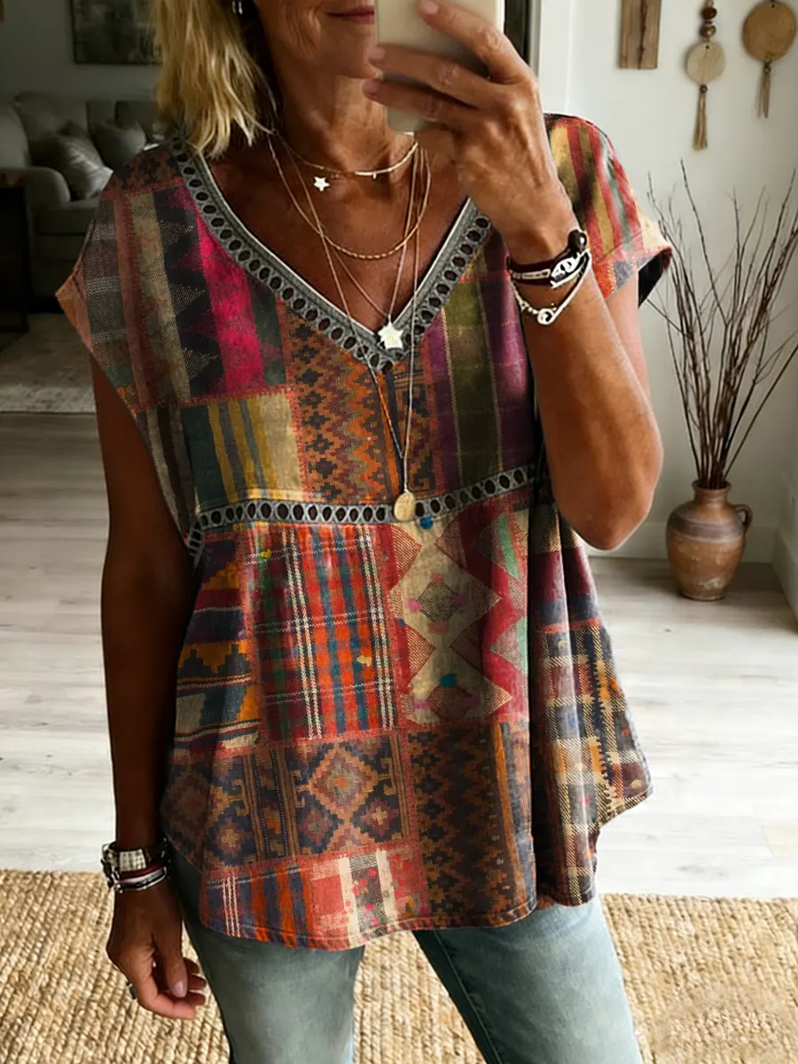 Ethnicity Totem Patchwork Women's Vintage Art Print Casual Short-sleeved V Neck Cutout Top$33.99 USD -