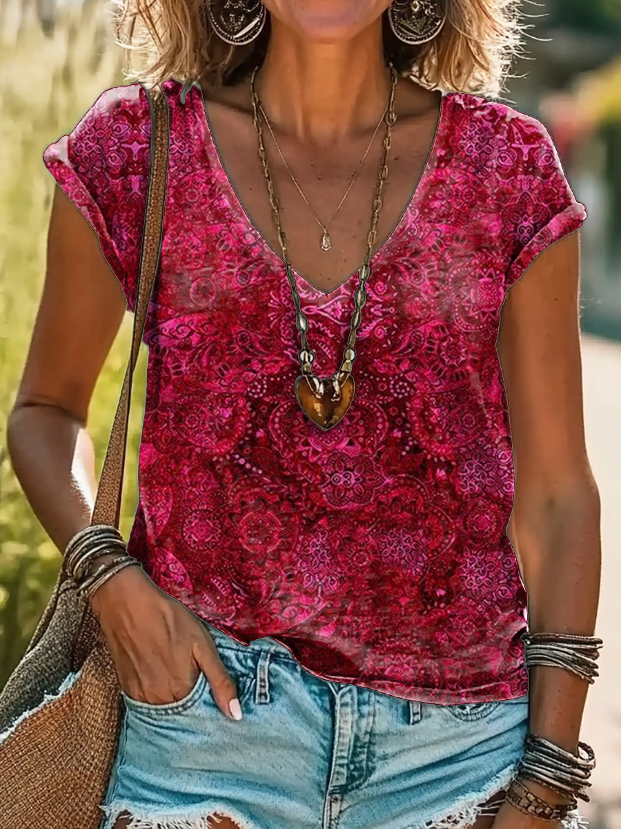 Women's Vintage Ethnic Floral Pattern Art Print V-neck Short-sleeve Top$25.99 USD -