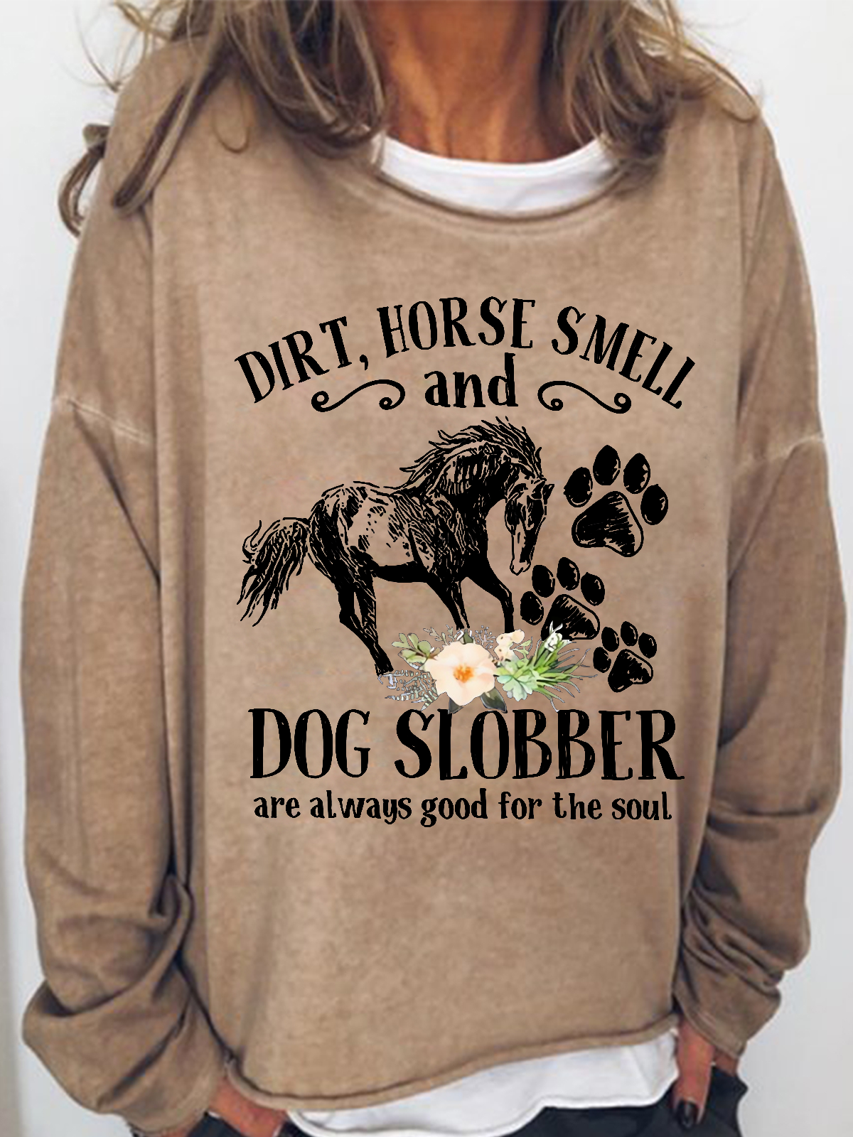 Women's Cute Horse And Dog Flower Dirt Horse Smell Simple Crew Neck Loose Sweatshirt$36.00 USD -