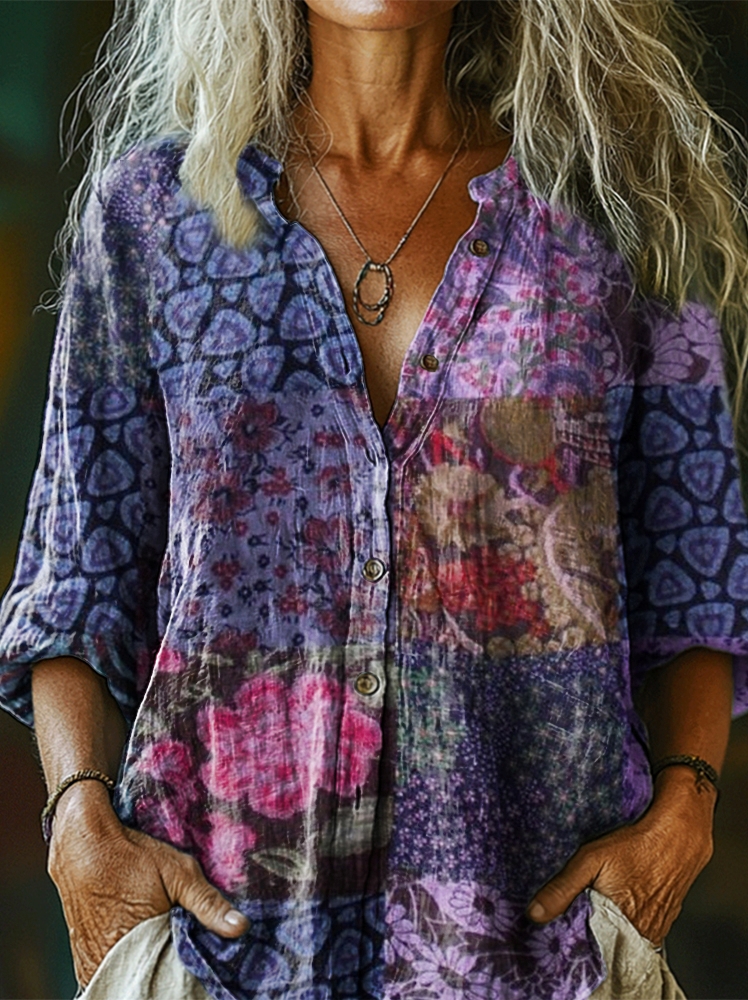Women's Patchwork Retro Floral Art Print Casual Cotton And Linen Shirt$39.99 USD -