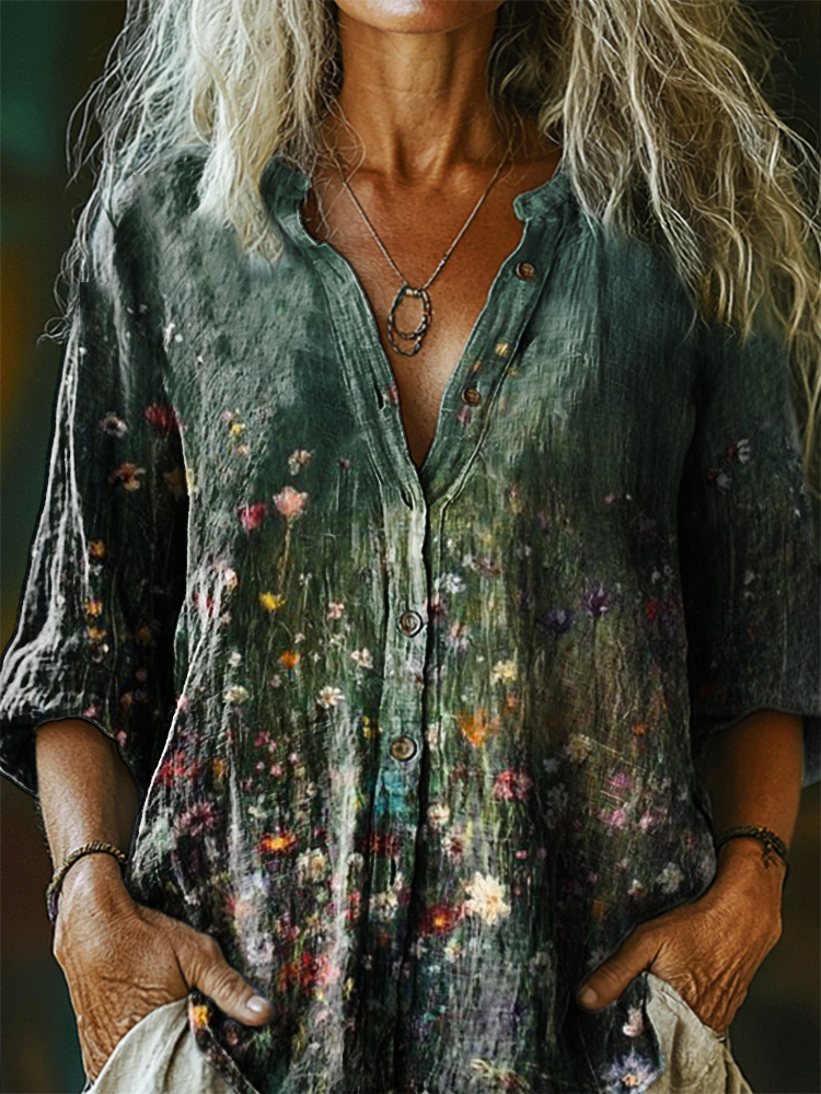 Women's Flowers Art Print Casual Cotton And Linen Shirt$24.99 USD -