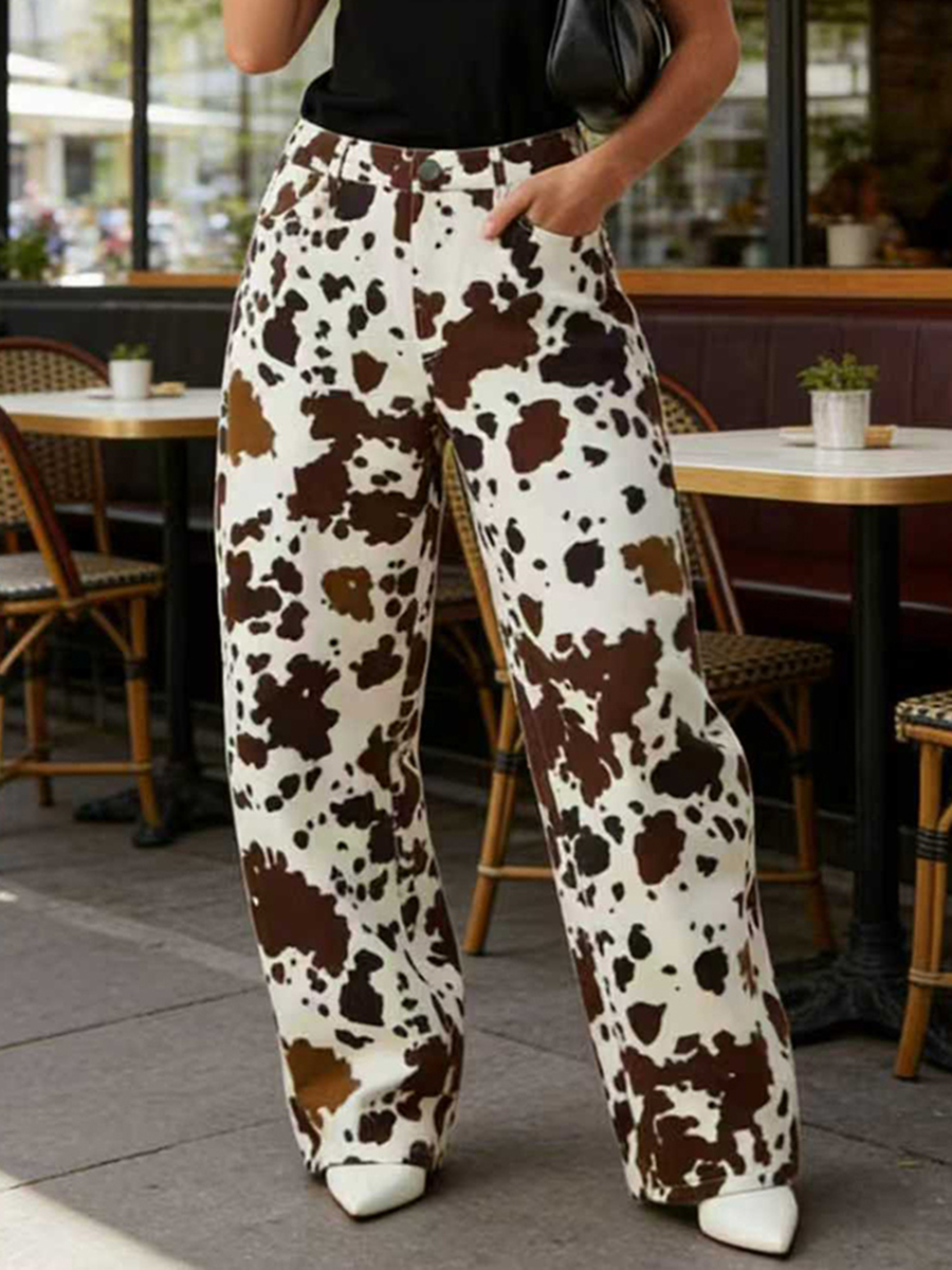 Contrast Color Cow Printed Split-Joint Elasticated Waist High Waisted Pants$47.99 USD -