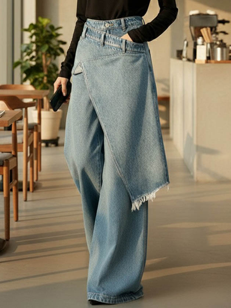 Asymmetric Buttoned Fringed Interlace Layered Pockets Solid Color High Waisted Irregularity Jean Pants Bottoms$86.99 USD -