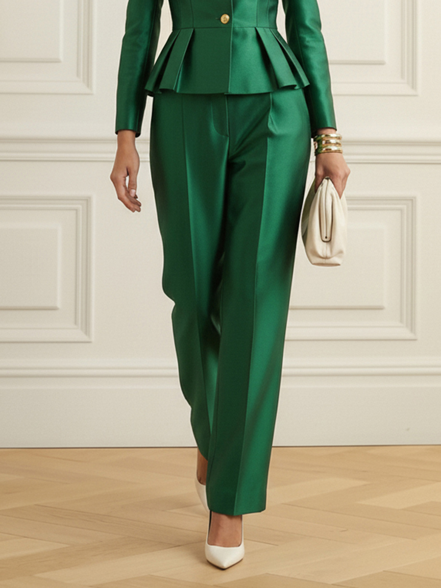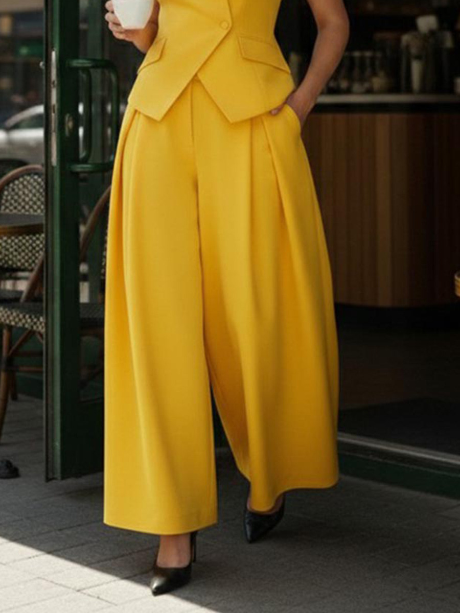 Buttoned Pleated Solid Color High Waisted Long Sleeves Lapel Outwear + Pants Two Pieces Set$90.99 USD -