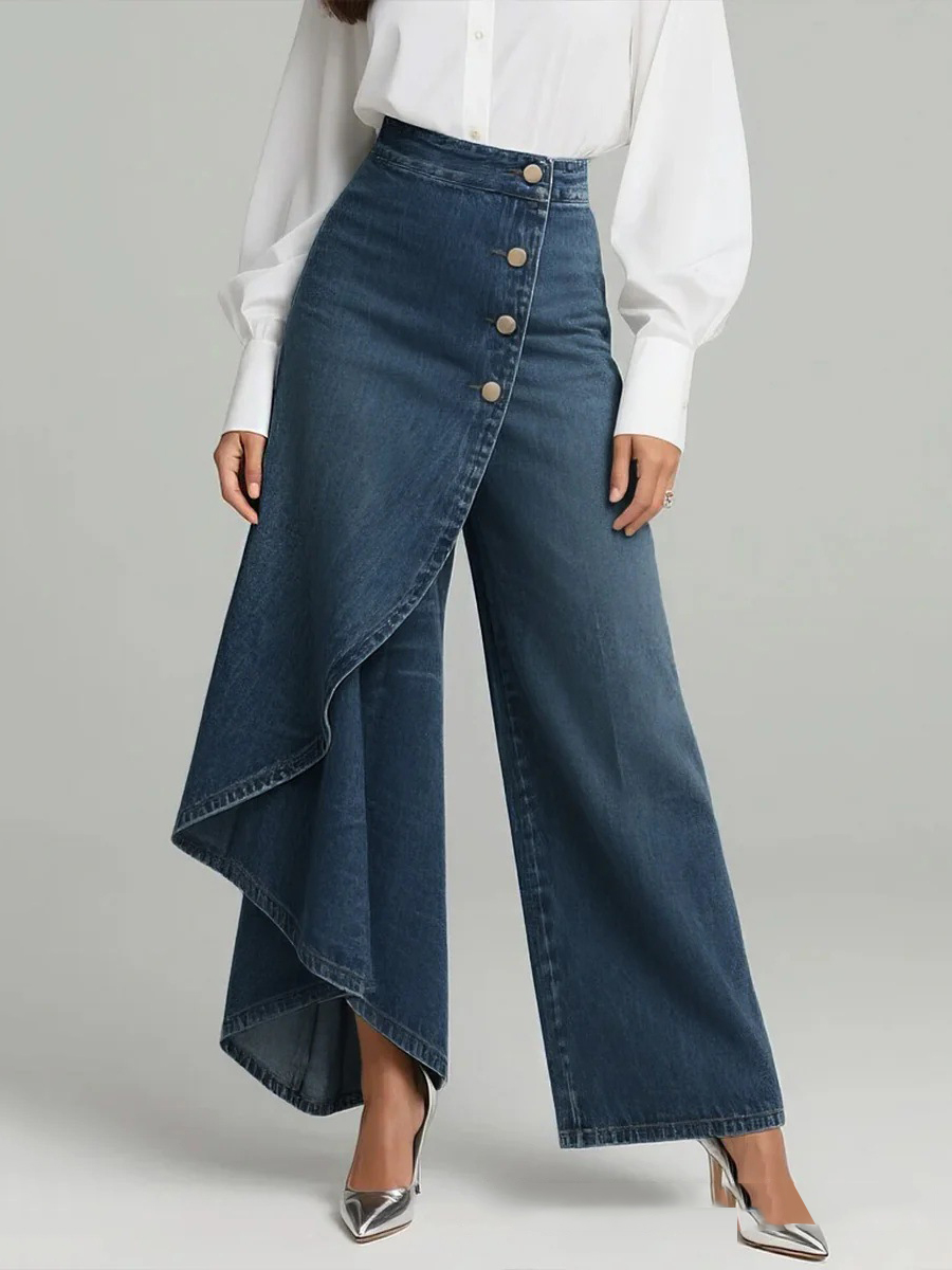 Buttoned Layered Pockets Solid Color Split-Joint High Waisted Irregularity Jean Pants Bottoms$64.99 USD -
