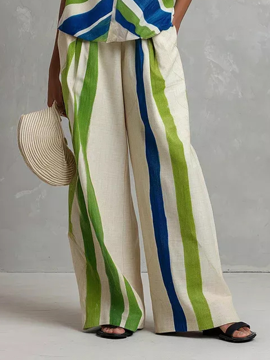 Contrast Color Pockets Split-Joint Striped Loose Wide Leg Pants$65.99 USD -