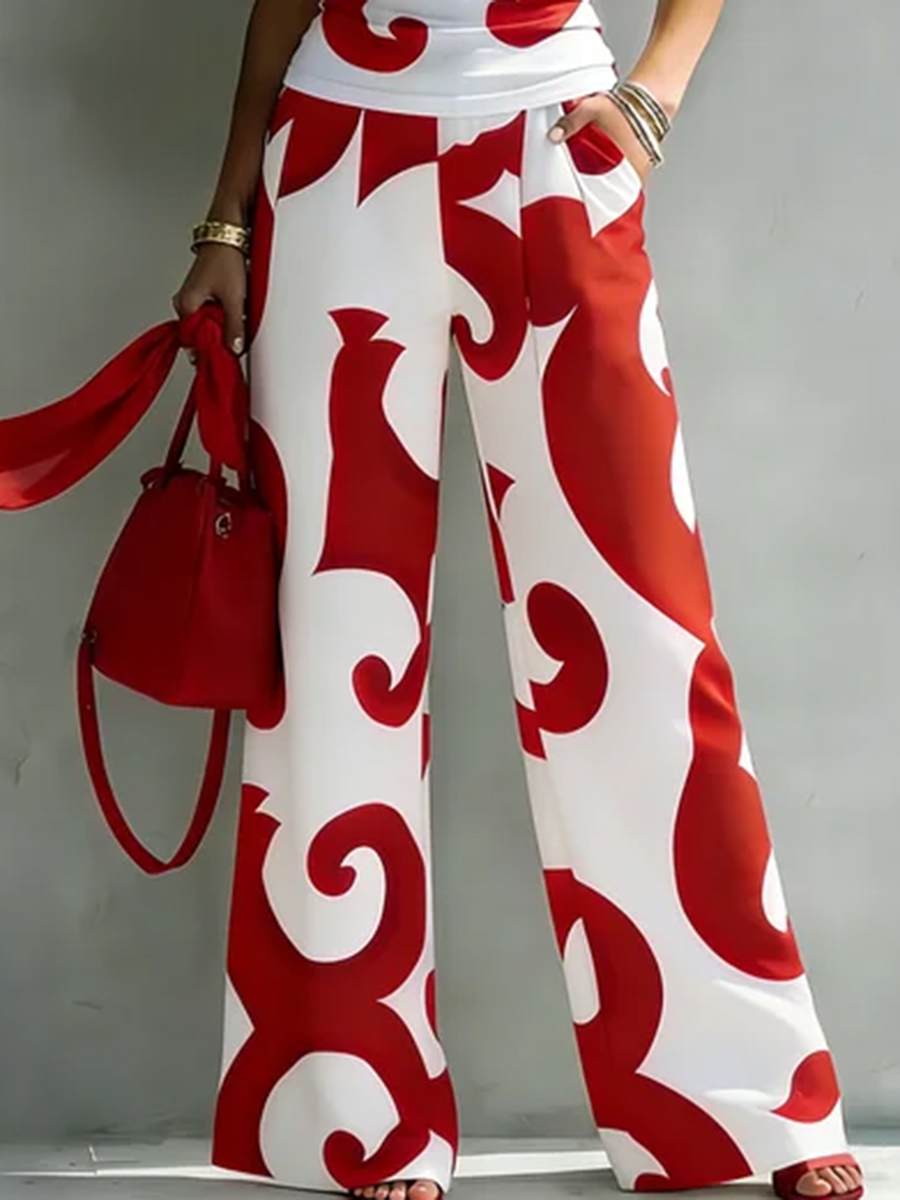 Abstract Printed Contrast Color Pockets Split-Joint Elasticated Waist High Waisted Pants$46.99 USD -