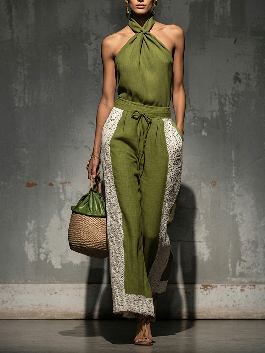 Women's Olive Green Linen Two-Piece Set With Halter Neck Twist Top & Lace Trim Wide-Leg Pants, Timeless Boho-Chic Style Set MDZ0906D0I$62.47 USD -