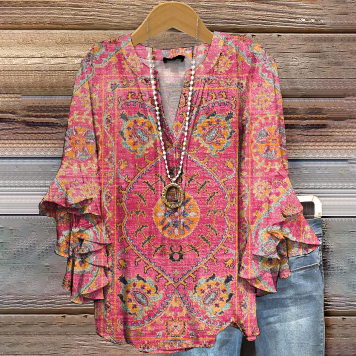 Women's Art Painting Ethnic Floral Contrast Retro Print V-Neck Ruffled Top$36.99 USD -